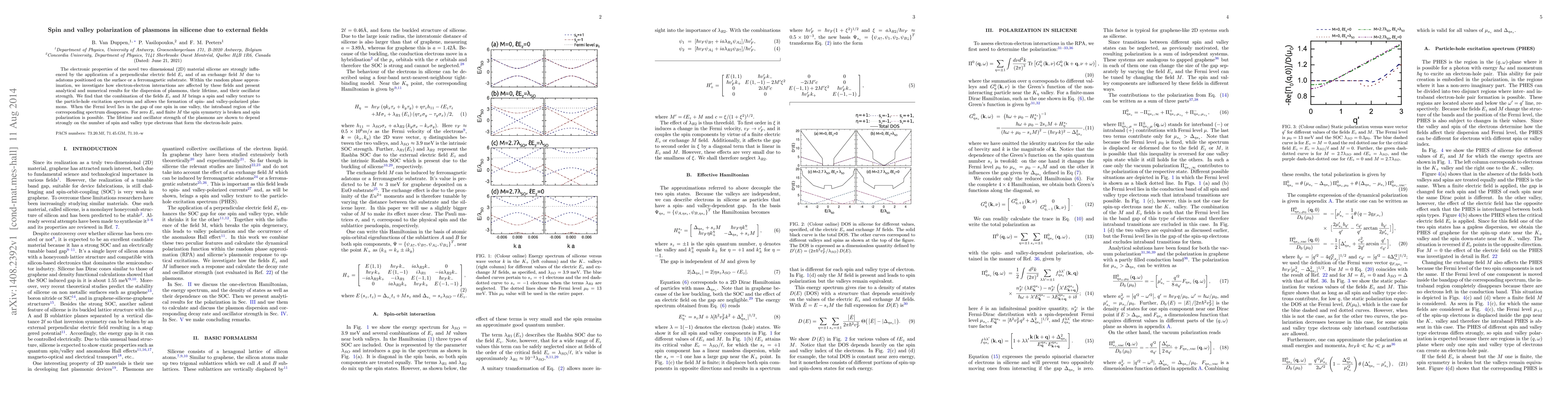 The electronic properties of the novel two dimensional (2D) material silicene are strongly influenced by the application of a perpendicular electric field $E_z$ and of an exchange field $M$ due to adatoms positioned on the surface or a ferromagnetic substrate. Within the random phase approximation, we investigate how electron-electron interactions are affected by these fields and present analytical and numerical results for the dispersion of plasmons, their lifetime, and their oscillator strength. We find that the combination of the fields $E_z$ and $M$ brings a spin and valley texture to the particle-hole excitation spectrum and allows the formation of spin- and valley-polarized plasmons. When the Fermi level lies in the gap of one spin in one valley, the intraband region of the corresponding spectrum disappears. For zero $E_z$ and finite $M$ the spin symmetry is broken and spin polarization is possible. The lifetime and oscillator strength of the plasmons are shown to depend strongly on the number of spin and valley type electrons that form the electron-hole pairs.