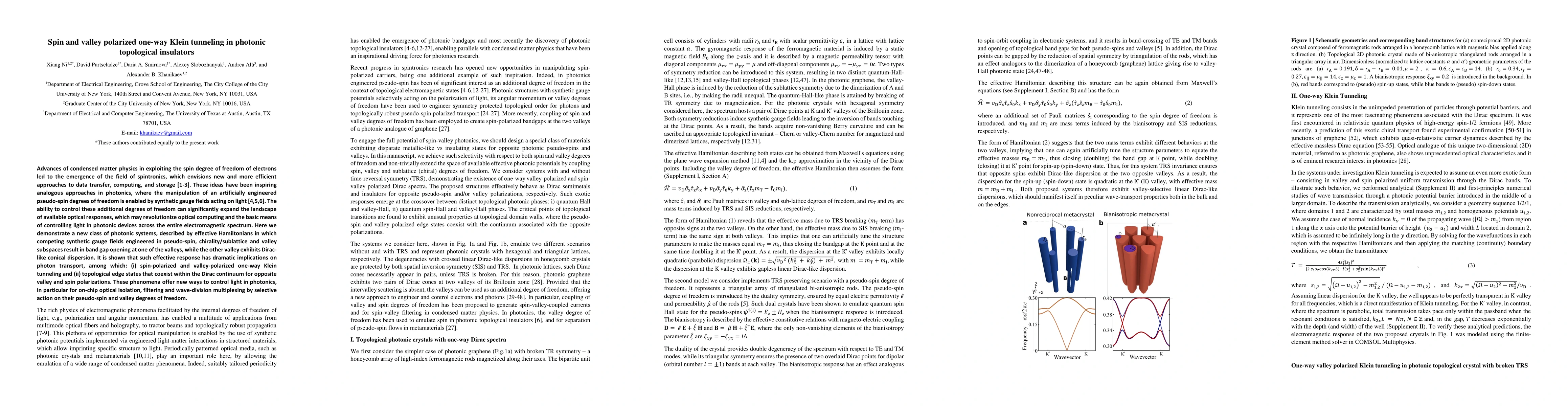 Advances of condensed matter physics in exploiting the spin degree of freedom of electrons led to the emergence of the field of spintronics, which envisions new and more efficient approaches to data transfer, computing, and storage [1-3]. These ideas have been inspiring analogous approaches in photonics, where the manipulation of an artificially engineered pseudo-spin degrees of freedom is enabled by synthetic gauge fields acting on light [4,5,6]. The ability to control these additional degrees of freedom can significantly expand the landscape of available optical responses, which may revolutionize optical computing and the basic means of controlling light in photonic devices across the entire electromagnetic spectrum. Here we demonstrate a new class of photonic systems, described by effective Hamiltonians in which competing synthetic gauge fields engineered in pseudo-spin, chirality/sublattice and valley subspaces result in band gap opening at one of the valleys, while the other valley exhibits Dirac-like conical dispersion. It is shown that such effective response has dramatic implications on photon transport, among which: (i) spin-polarized and valley-polarized one-way Klein tunneling and (ii) topological edge states that coexist within the Dirac continuum for opposite valley and spin polarizations. These phenomena offer new ways to control light in photonics, in particular for on-chip optical isolation, filtering and wave-division multiplexing by selective action on their pseudo-spin and valley degrees of freedom.