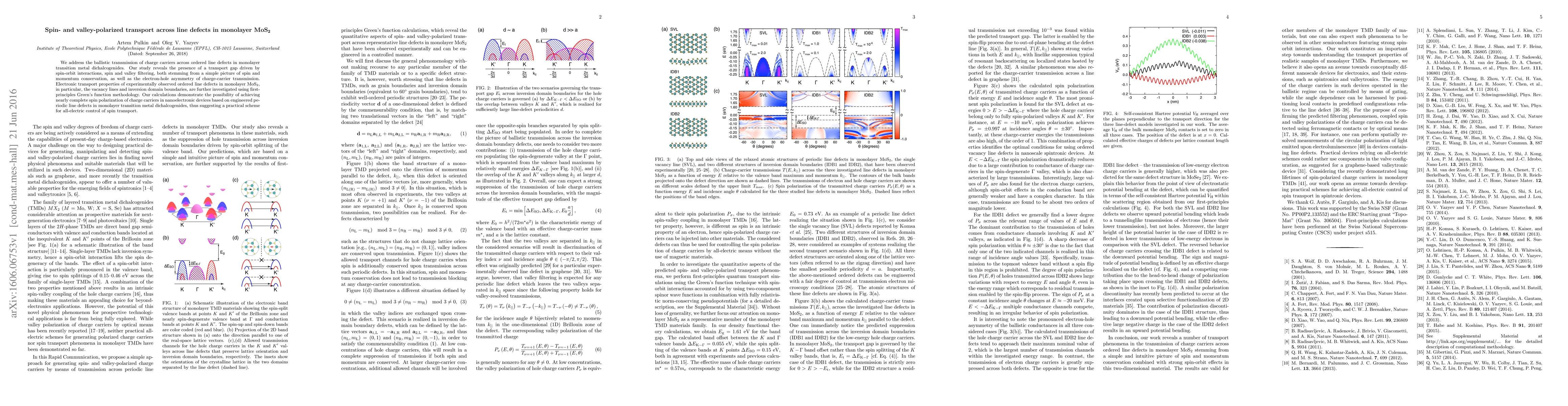 This paper investigates the ballistic transport of charge carriers across line defects in monolayer MoS$_2$, revealing a transport gap and spin-valley polarization due to spin-orbit interactions. First-principles calculations show that engineered periodic line defects can achieve nearly complete spin polarization, suggesting a practical method for all-electric control of spin transport in nanoelectronic devices.