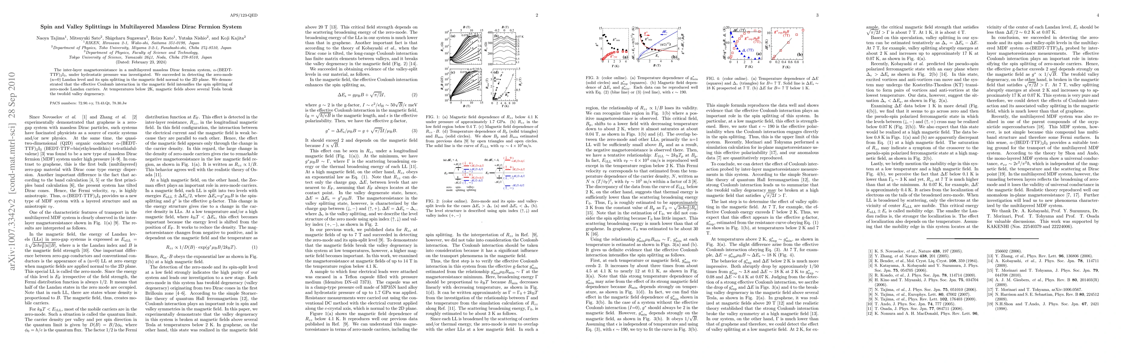 This study investigates the magnetoresistance in a multilayered massless Dirac fermion system under hydrostatic pressure, revealing spin splitting in the zero-mode Landau level and intensified spin splitting due to effective Coulomb interactions. At low temperatures and high magnetic fields, the twofold valley degeneracy is broken.