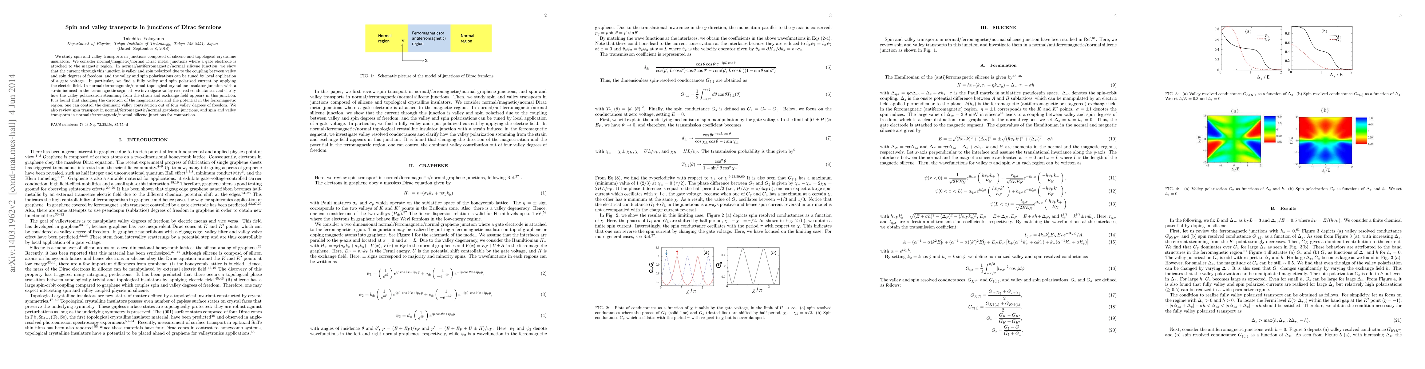 This paper investigates spin and valley transport in junctions of Dirac fermions, specifically focusing on silicene and topological crystalline insulators. The study demonstrates tunable valley and spin polarizations in silicene junctions via gate voltage, and shows how valley polarization in topological crystalline insulator junctions can be controlled by magnetization direction and potential in the ferromagnetic segment.