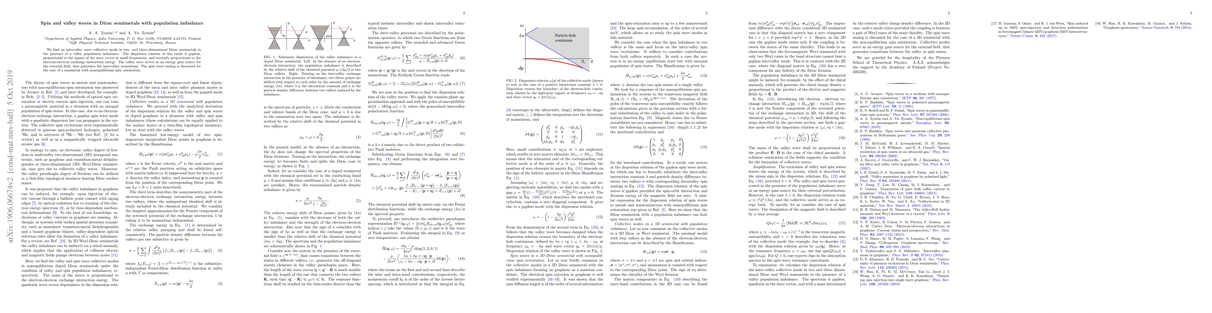 This research identifies an intervalley wave collective mode in Dirac semimetals exhibiting valley population imbalance, characterized by a gapless dispersion relation dependent on the square of the wave vector at low frequencies. The study also examines the analogous spin wave in semimetals with nonequilibrium spin orientation.