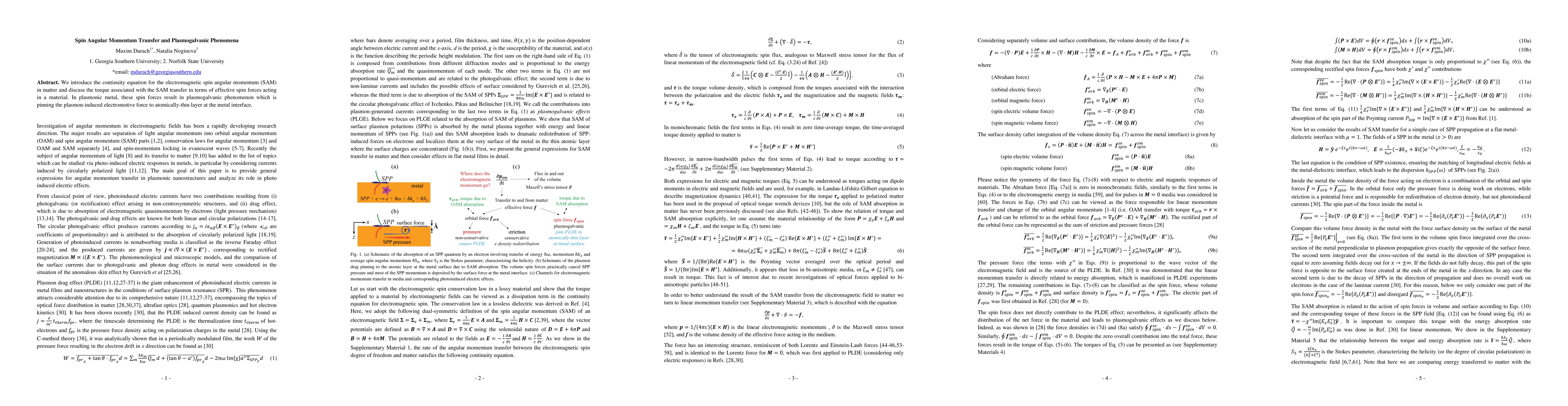 We introduce the continuity equation for the electromagnetic spin angular momentum (SAM) in matter and discuss the torque associated with the SAM transfer in terms of effective spin forces acting in a material. In plasmonic metal, these spin forces result in plasmogalvanic phenomenon which is pinning the plasmon-induced electromotive force to atomically-thin layer at the metal interface.