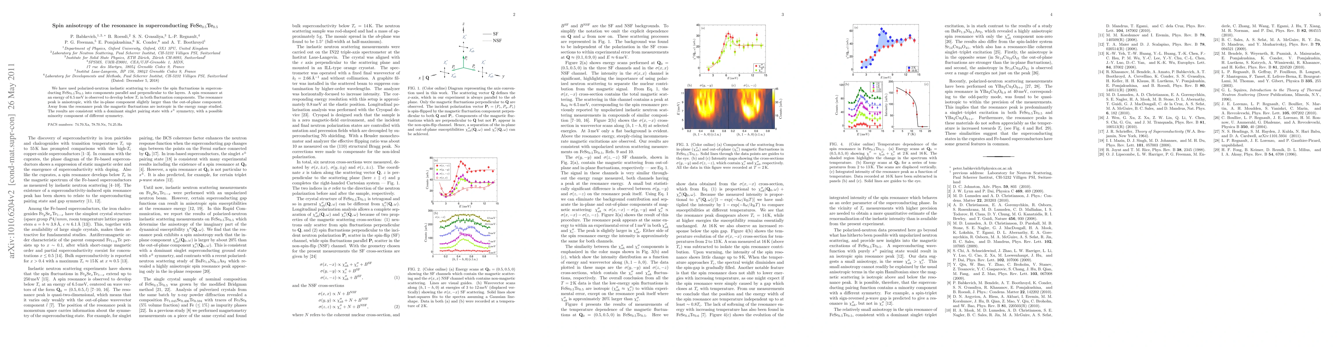 The study used polarized-neutron inelastic scattering to reveal anisotropic spin fluctuations in superconducting FeSe0.5Te0.5. A spin resonance at 6.5 meV emerges below T_c, with a slightly stronger in-plane component than out-of-plane, suggesting dominant singlet pairing with s± symmetry and a minor component of different symmetry.
