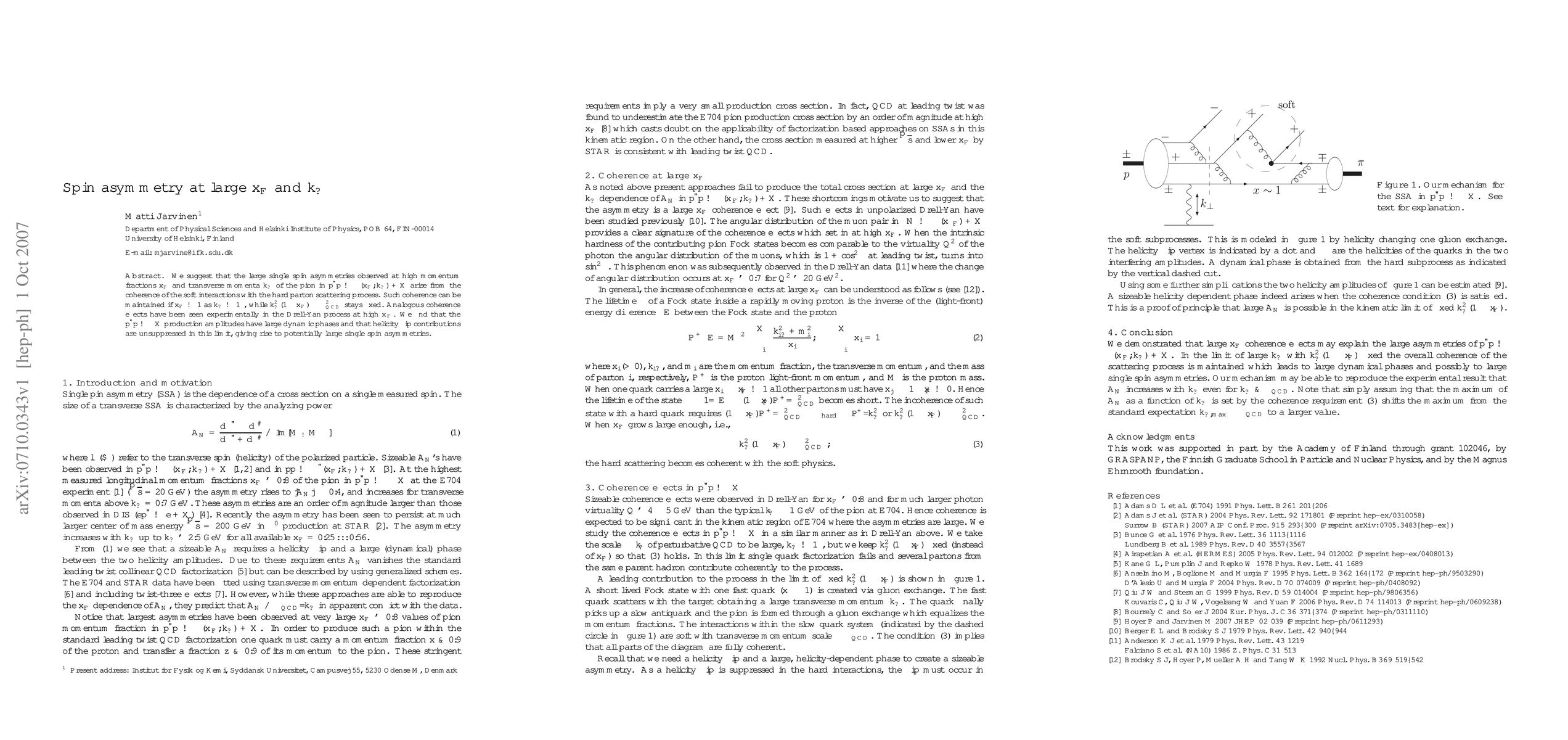 We suggest that the large single spin asymmetries observed at high momentum fractions x_F and transverse momenta k_T of the pion in p^\uparrow p -> \pi(x_F,k_T)+X arise from the coherence of the soft interactions with the hard parton scattering process. Such coherence can be maintained if x_F -> 1 as k_T -> \infty, while k_T^2(1-x_F) ~ \Lambda_{QCD}^2 stays fixed. Analogous coherence effects have been seen experimentally in the Drell-Yan process at high x_F. We find that the p^\uparrow p -> \pi X production amplitudes have large dynamic phases and that helicity flip contributions are unsuppressed in this limit, giving rise to potentially large single spin asymmetries.
