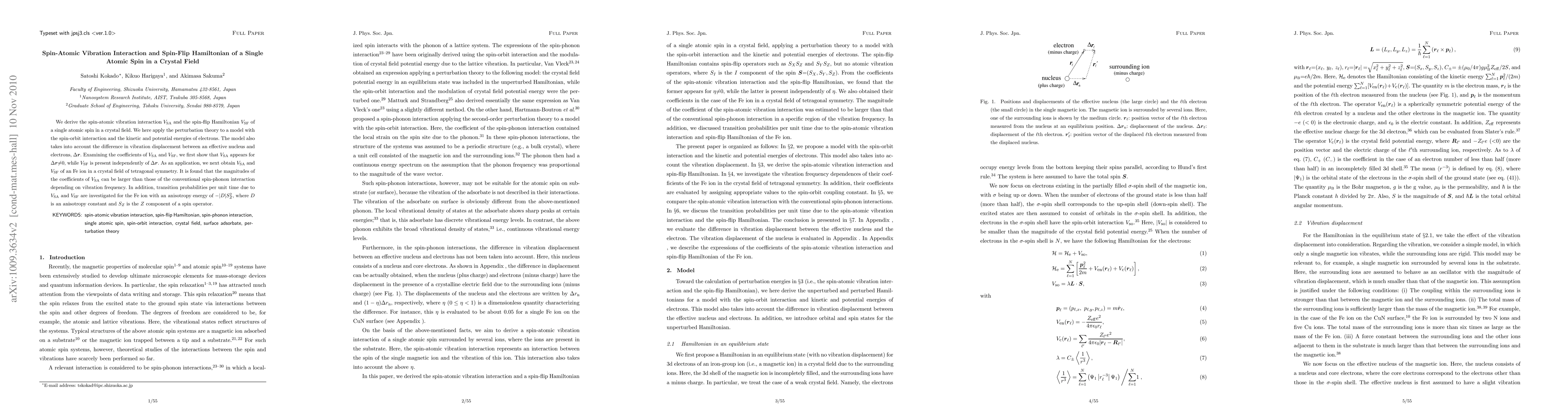 This paper derives the spin-atomic vibration interaction $V_{\rm SA}$ and spin-flip Hamiltonian $V_{\rm SF}$ for a single atomic spin in a crystal field, showing that $V_{\rm SA}$ depends on nuclear-electron displacement differences, while $V_{\rm SF}$ is independent. It applies these findings to an Fe ion in a tetragonal crystal field, revealing that $V_{\rm SA}$'s coefficients can exceed conventional spin-phonon interaction values.