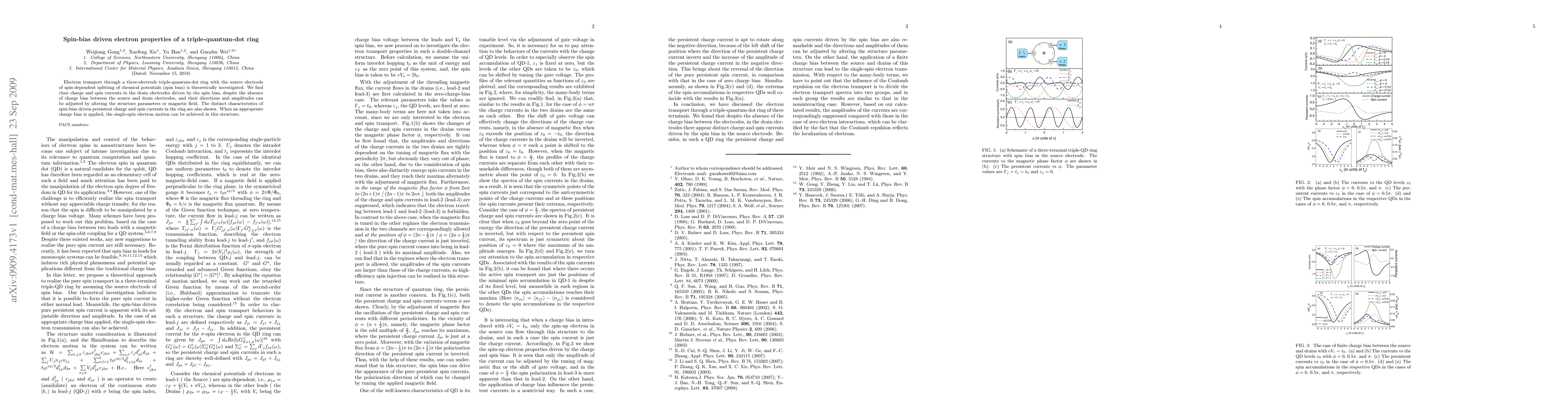 This paper investigates electron transport in a triple-quantum-dot ring with spin-dependent source splitting, revealing spin-bias driven charge and spin currents without charge bias. The currents' direction and amplitude are tunable via structural changes or magnetic field.