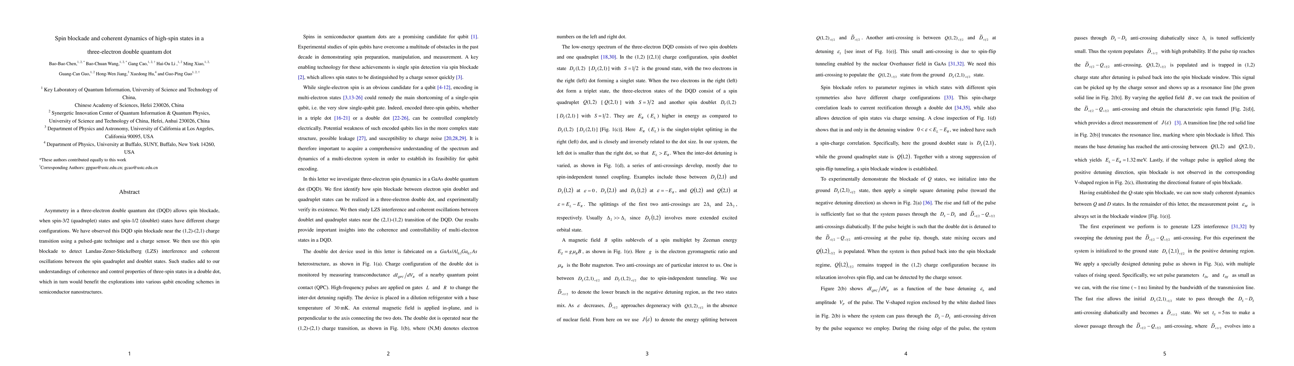 This study observes spin blockade in a three-electron double quantum dot, revealing different charge configurations for spin-3/2 and spin-1/2 states. Using a pulsed-gate technique, researchers detect Landau-Zener-Stückelberg interference and coherent oscillations between these states, enhancing the understanding of coherence and control in three-spin systems, potentially aiding qubit development in semiconductor nanostructures.