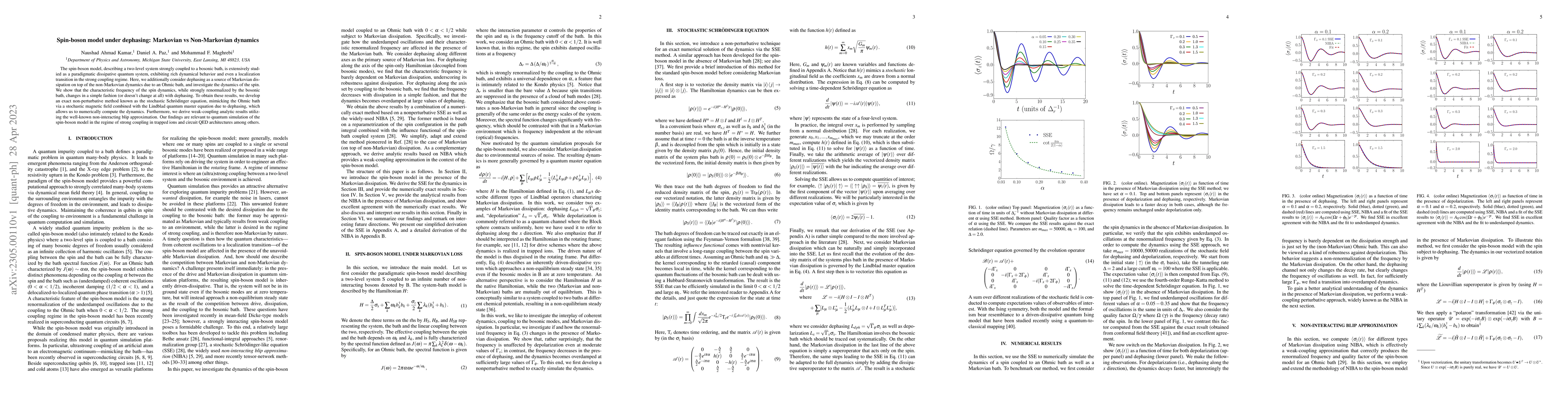 This paper explores the dynamics of a spin-boson model under both non-Markovian and Markovian dissipation, focusing on the impact of dephasing. It employs a stochastic Schrödinger equation and Lindblad master equation to numerically and analytically study the spin dynamics, revealing that dephasing affects the characteristic frequency in a predictable manner.