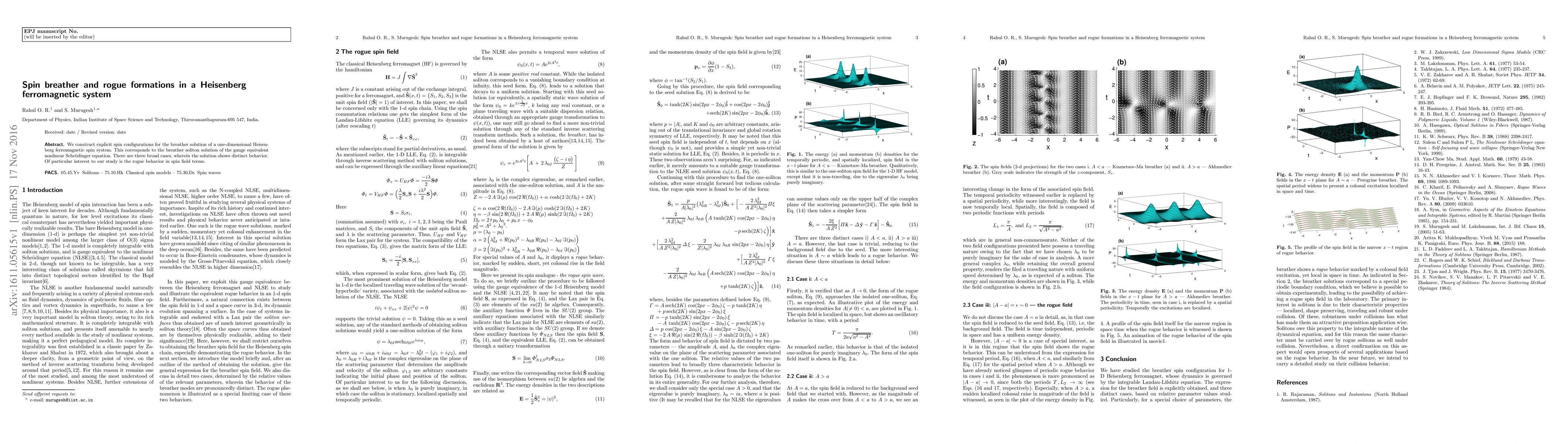 We construct explicit spin configurations for the breather solution of a one-dimensional Heisenberg ferromagnetic spin system. This corresponds to the breather soliton solution of the gauge equivalent nonlinear Schr\"{o}dinger equation. There are three broad cases, wherein the solution shows distinct behavior. Of particular interest to our study is the rogue behavior in spin field terms.