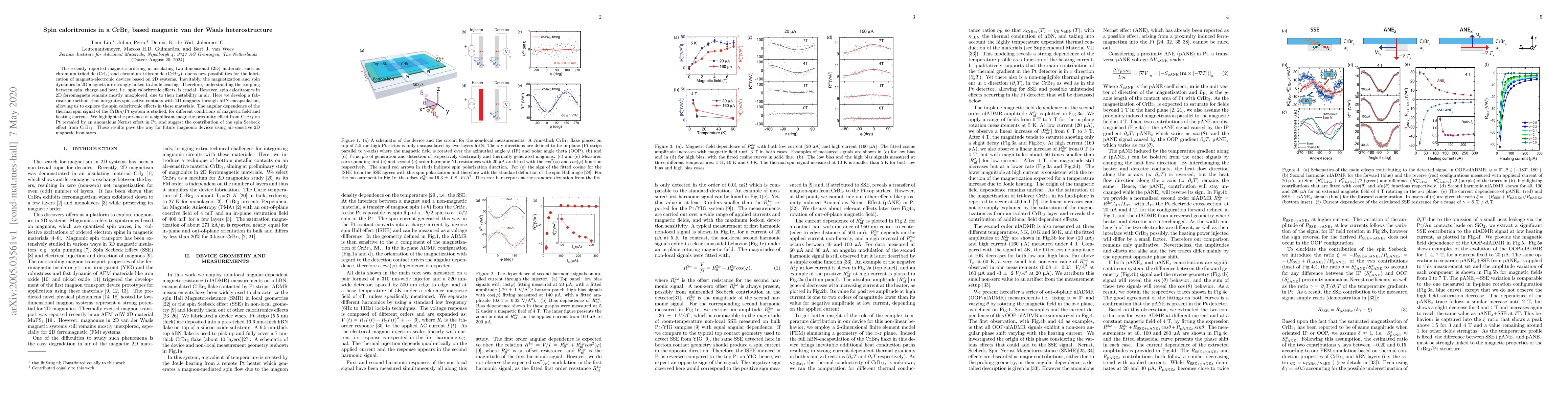 The recently reported magnetic ordering in insulating two-dimensional (2D) materials, such as chromium triiodide (CrI$_3$) and chromium tribromide (CrBr$_3$), opens new possibilities for the fabrication of magneto-electronic devices based on 2D systems. Inevitably, the magnetization and spin dynamics in 2D magnets are strongly linked to Joule heating. Therefore, understanding the coupling between spin, charge and heat, i.e. spin caloritronic effects, is crucial. However, spin caloritronics in 2D ferromagnets remains mostly unexplored, due to their instability in air. Here we develop a fabrication method that integrates spin-active contacts with 2D magnets through hBN encapsulation, allowing us to explore the spin caloritronic effects in these materials. The angular dependence of the thermal spin signal of the CrBr$_3$/Pt system is studied, for different conditions of magnetic field and heating current. We highlight the presence of a significant magnetic proximity effect from CrBr$_3$ on Pt revealed by an anomalous Nernst effect in Pt, and suggest the contribution of the spin Seebeck effect from CrBr$_3$. These results pave the way for future magnonic devices using air-sensitive 2D magnetic insulators.