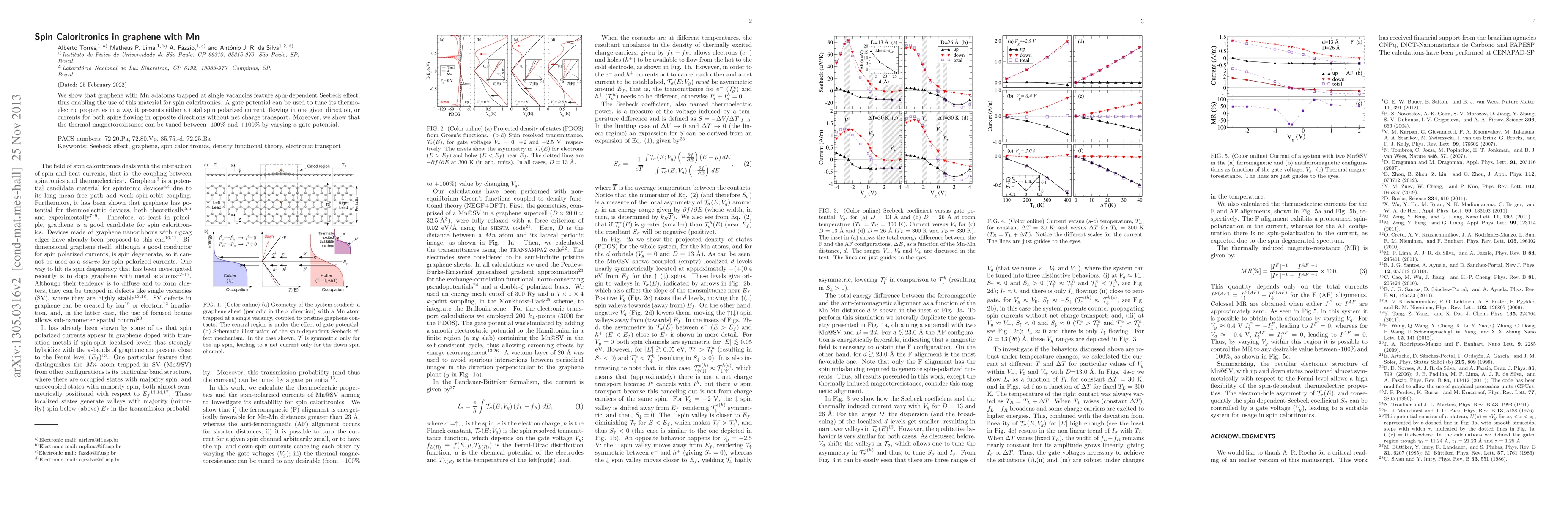 Graphene doped with Mn adatoms at single vacancies demonstrates a spin-dependent Seebeck effect, making it suitable for spin caloritronics. The thermoelectric properties can be tuned by a gate potential to either produce total spin-polarized current or opposite spin currents without net charge transport, and thermal magnetoresistance can be varied from $-100\%$ to $+100\%$.