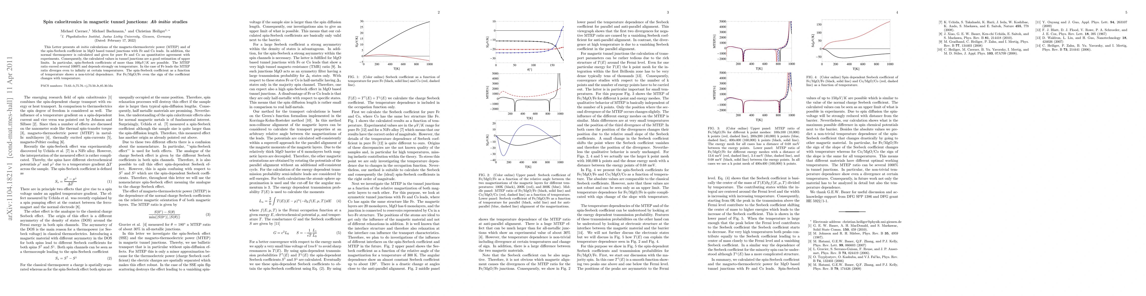This Letter presents ab initio calculations of the magneto-thermoelectric power (MTEP) and of the spin-Seebeck coefficient in MgO based tunnel junctions with Fe and Co leads. In addition, the normal thermopower is calculated and gives for pure Fe and Co an quantitative agreement with experiments. Consequently, the calculated values in tunnel junctions are a good estimation of upper limits. In particular, spin-Seebeck coefficients of more than 100 \mu V/K are possible. The MTEP ratio exceed several 1000% and depends strongly on temperature. In the case of Fe leads the MTEP ratio diverges even to infinity at certain temperatures. The spin-Seebeck coefficient as a function of temperature shows a non-trivial dependence. For Fe/MgO/Fe even the sign of the coefficient changes with temperature.
