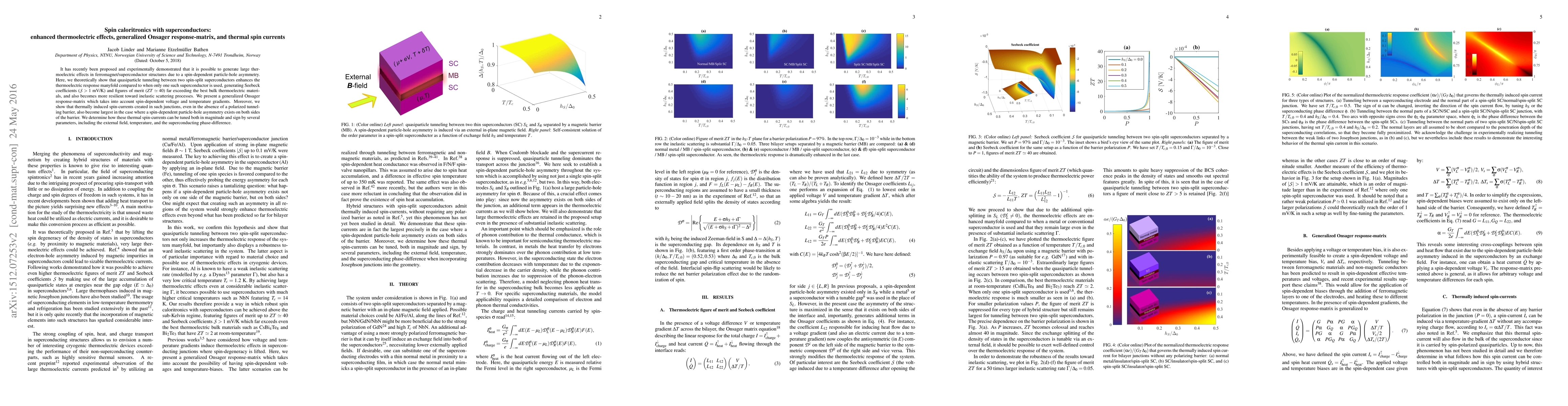 This paper theoretically demonstrates that quasiparticle tunneling between two spin-split superconductors significantly enhances thermoelectric effects, yielding exceptional Seebeck coefficients and figures of merit. It also introduces a generalized Onsager response-matrix to account for spin-dependent voltage and temperature gradients, and highlights the generation of large thermal spin currents in such junctions.
