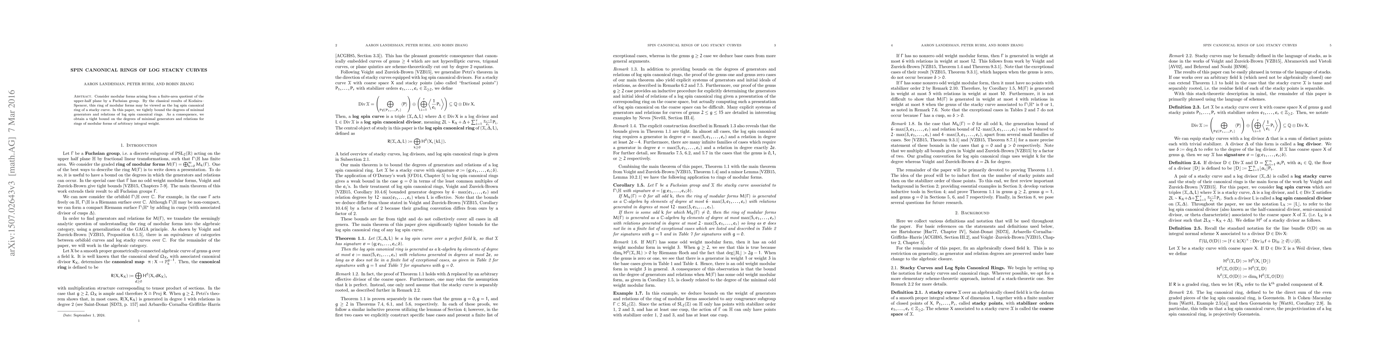 Consider modular forms arising from a finite-area quotient of the upper-half plane by a Fuchsian group. By the classical results of Kodaira-Spencer, this ring of modular forms may be viewed as the log spin canonical ring of a stacky curve. In this paper, we tightly bound the degrees of minimal generators and relations of log spin canonical rings. As a consequence, we obtain a tight bound on the degrees of minimal generators and relations for rings of modular forms of arbitrary integral weight.