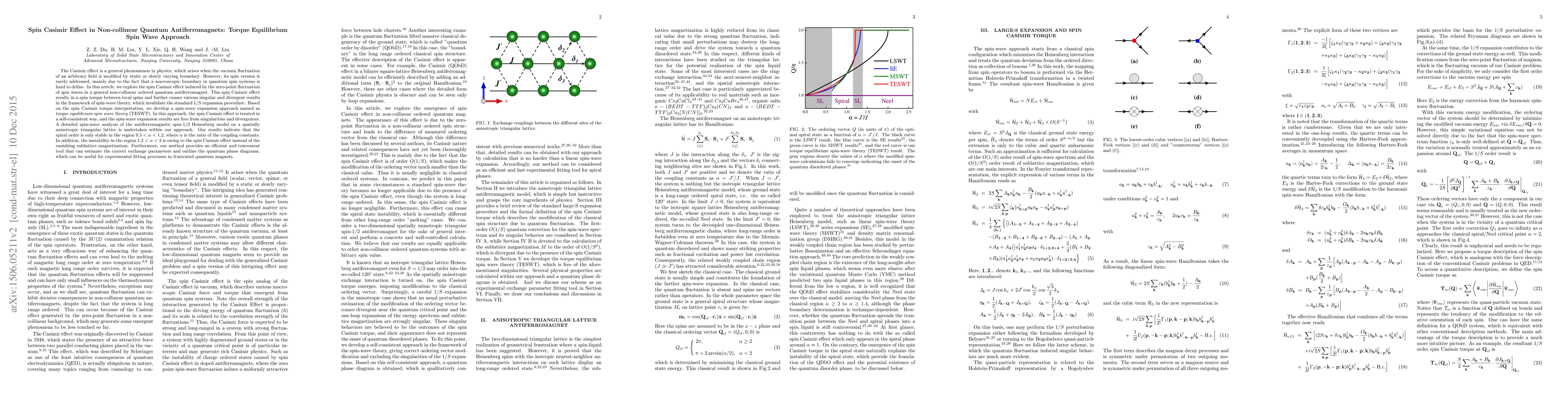 The Casimir effect is a general phenomenon in physics, which arises when the vacuum fluctuation of an arbitrary field is modified by static or slowly varying boundary. However, its spin version is rarely addressed, mainly due to the fact that a macroscopic boundary in quantum spin systems is hard to define. In this article, we explore the spin Casimir effect induced by the zero-point fluctuation of spin waves in a general non-collinear ordered quantum antiferromagnet. This spin Casimir effect results in a spin torque between local spins and further causes various singular and divergent results in the framework of spin-wave theory, which invalidate the standard $1/S$ expansion procedure. To avoid this dilemma, we develop a self-consistent spin-wave expansion approach, which preserves the spin-wave expansion away from singularities and divergence. A detailed spin-wave analysis of the antiferromagnetic spin-1/2 Heisenberg model on a spatially anisotropic triangular lattice is undertaken within our approach. Our results indicate that the spiral order is only stable in the region $0.5<\alpha<1.2$, where $\alpha$ is the ratio of the coupling constants. In addition, the instability in the region $1.2<\alpha<2$ is owing to the spin Casimir effect instead of the vanishing sublattice magnetization. And this extended spiral instable region may host some quantum disordered phases besides the quantum order by disorder induced Neel phase. Furthermore, our method provides an efficient and convenient tool that can estimate the correct exchange parameters and outline the quantum phase diagrams, which can be useful for experimental fitting processes in frustrated quantum magnets.