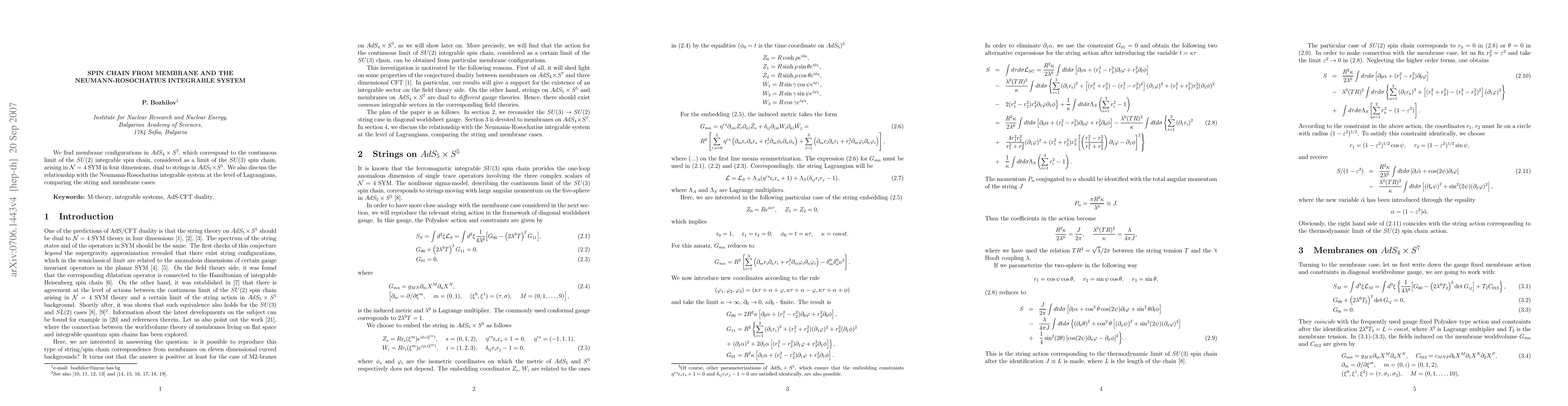We find membrane configurations in AdS_4 x S^7, which correspond to the continuous limit of the SU(2) integrable spin chain, considered as a limit of the SU(3) spin chain, arising in N=4 SYM in four dimensions, dual to strings in AdS_5 x S^5. We also discuss the relationship with the Neumann-Rosochatius integrable system at the level of Lagrangians, comparing the string and membrane cases.