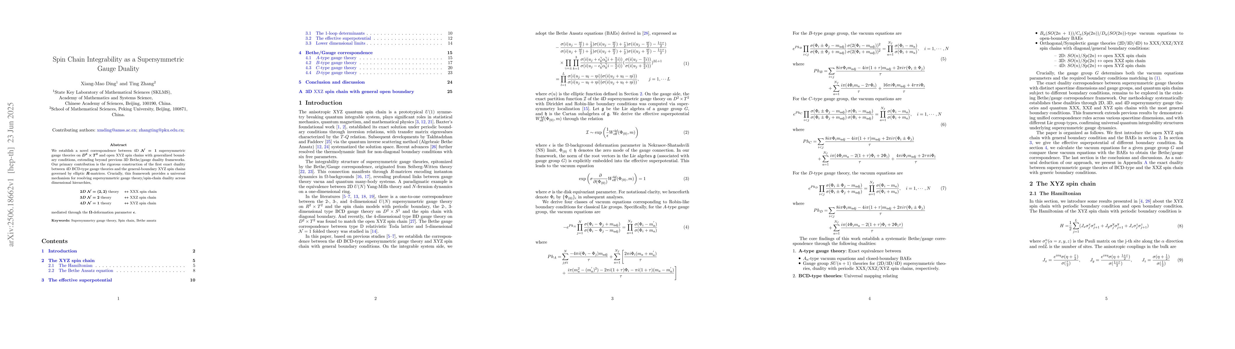We establish a novel correspondence between 4D $\mathcal N=1$ supersymmetric gauge theories on $D^2\times T^2$ and open XYZ spin chains with generalized boundary conditions, extending beyond previous 3D Bethe/gauge duality frameworks. Our primary contribution is the rigorous construction of the first exact duality between 4D BCD-type gauge theories and general-boundary XYZ spin chains governed by elliptic $R$-matrices. This framework provides a universal mechanism for resolving supersymmetric gauge theory/spin-chain duality across dimensional hierarchies: 2D $\mathcal{N}=(2,2)$ $\longleftrightarrow$ XXX spin chain, 3D $\mathcal{N}=2$ $\longleftrightarrow$ XXZ spin chain, 4D $\mathcal{N}=1$ $\longleftrightarrow$ XYZ spin chain, mediated through the $\Omega$-deformation parameter $\epsilon$.