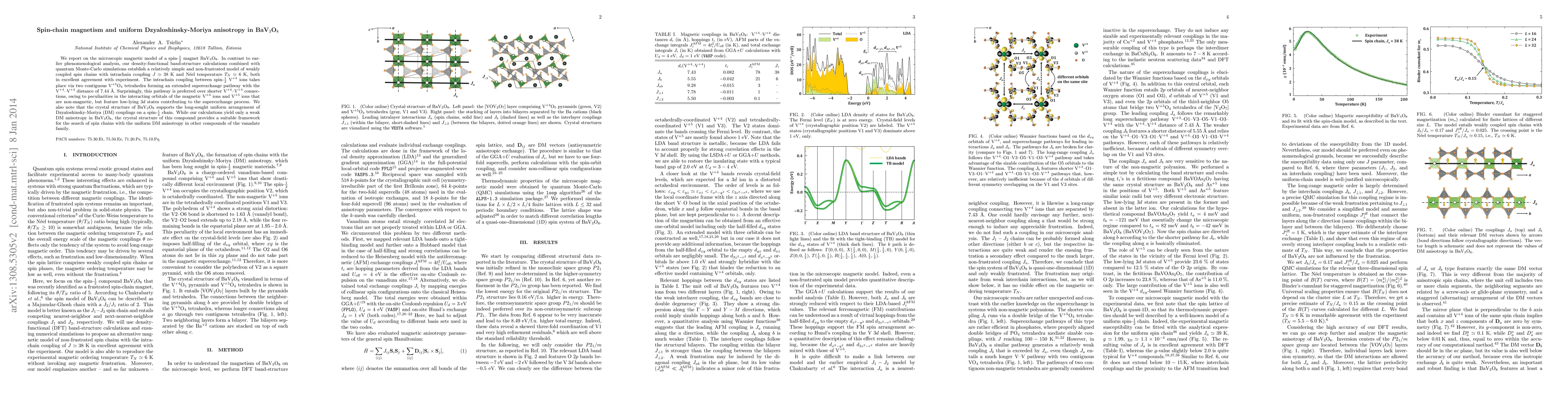 We report on the microscopic magnetic model of a spin-1/2 magnet BaV$_3$O$_8$. In contrast to earlier phenomenological analysis, our density-functional band-structure calculations combined with quantum Monte-Carlo simulations establish a relatively simple and non-frustrated model of weakly coupled spin chains with the intrachain coupling of $J\sim$ 38 K and the Neel temperature of $T_N\sim$ 6 K, both in excellent agreement with the experiment. The intrachain coupling between the spin-1/2 V$^{+4}$ ions takes place via two contiguous V$^{+5}$O$_4$ tetrahedra forming an extended superexchange pathway with the V$^{+4}$--V$^{+4}$ distance of 7.44 A. Surprisingly, this pathway is preferred over shorter V$^{+4}$--V$^{+4}$ connections, owing to peculiarities in the interacting orbitals of the magnetic V$^{+4}$ ions and V$^{+5}$ ions that are non-magnetic, but feature low-lying $3d$ states contributing to the superexchange process. We also note that the crystal structure of BaV$_3$O$_8$ supports the long-sought uniform arrangement of Dzyaloshinsky-Moriya (DM) couplings on a spin-1/2 chain. While our calculations yield only a weak DM anisotropy in BaV$_3$O$_8$, the crystal structure of this compound provides a suitable framework for the search of spin chains with the uniform DM anisotropy in other compounds of the vanadate family.