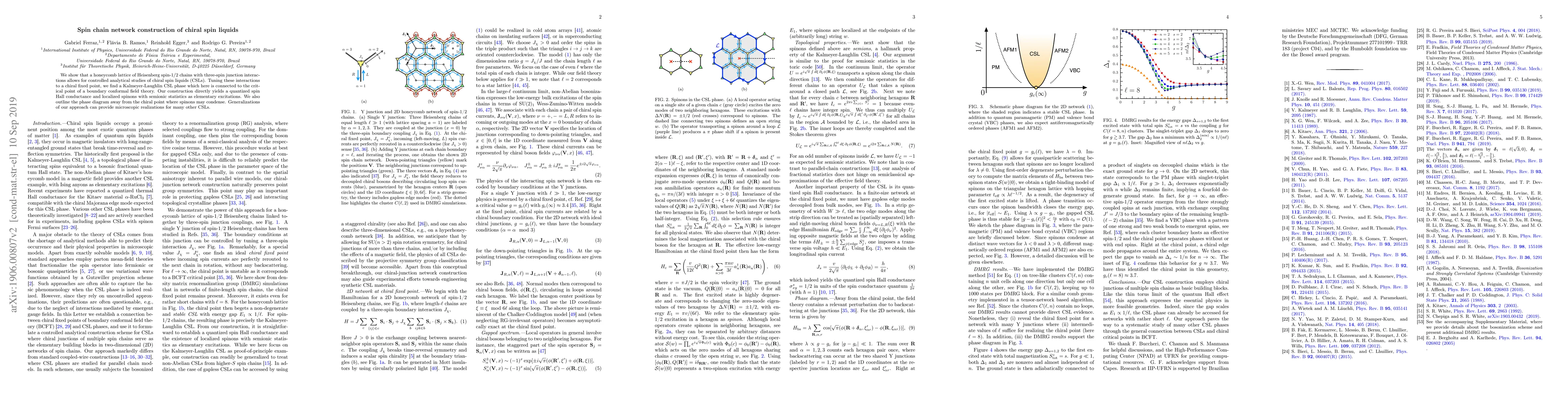 This paper constructs a honeycomb lattice of Heisenberg spin-$1/2$ chains with three-spin junction interactions to study chiral spin liquids, revealing a Kalmeyer-Laughlin phase with quantized spin Hall conductance and semionic spinons, and outlines a phase diagram for spinon condensation.