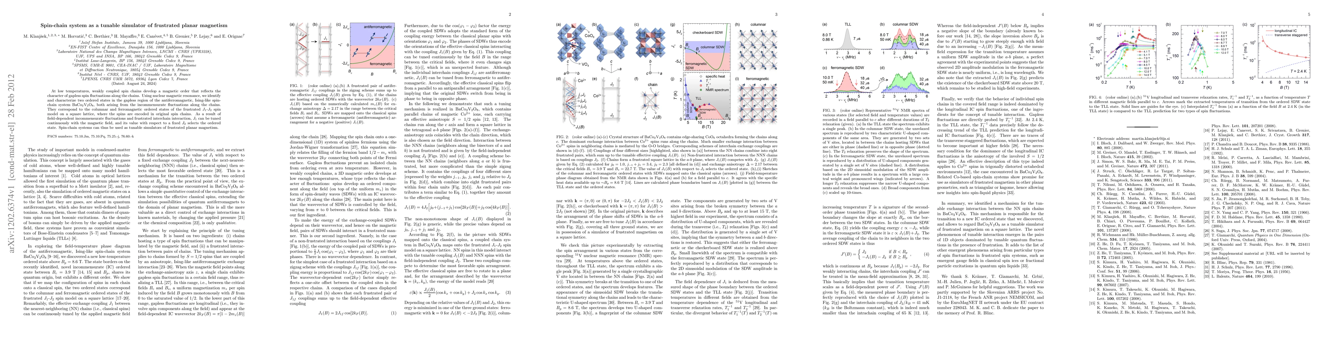 At low temperatures, weakly coupled spin chains develop a magnetic order that reflects the character of gapless spin fluctuations along the chains. Using nuclear magnetic resonance, we identify and characterize two ordered states in the gapless region of the antiferromagnetic, Ising-like spin-chain system BaCo2V2O8, both arising from the incommensurate fluctuations along the chains. They correspond to the columnar and ferromagnetic ordered states of the frustrated J1-J2 spin model on a square lattice, where the spins are encoded in original spin chains. As a result of field-dependent incommensurate fluctuations and frustrated interchain interaction, J1 can be tuned continuously with the magnetic field, and its value with respect to a fixed J2 selects the ordered state. Spin-chain systems can thus be used as tunable simulators of frustrated planar magnetism.