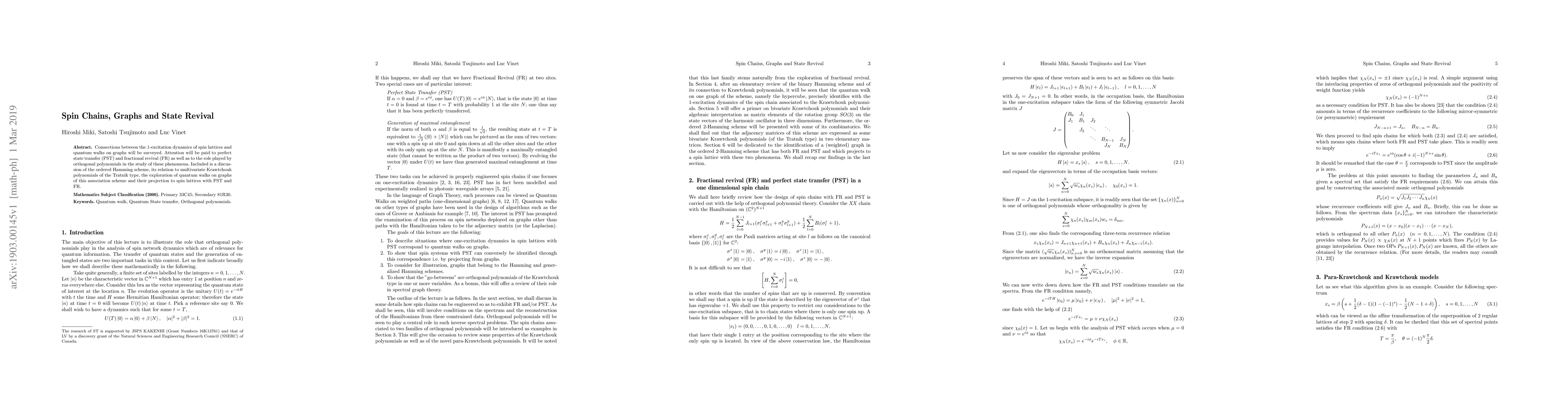 Connections between the 1-excitation dynamics of spin lattices and quantum walks on graphs will be surveyed. Attention will be paid to perfect state transfer (PST) and fractional revival (FR) as well as to the role played by orthogonal polynomials in the study of these phenomena. Included is a discussion of the ordered Hamming scheme, its relation to multivariate Krawtchouk polynomials of the Tratnik type, the exploration of quantum walks on graphs of this association scheme and their projection to spin lattices with PST and FR.
