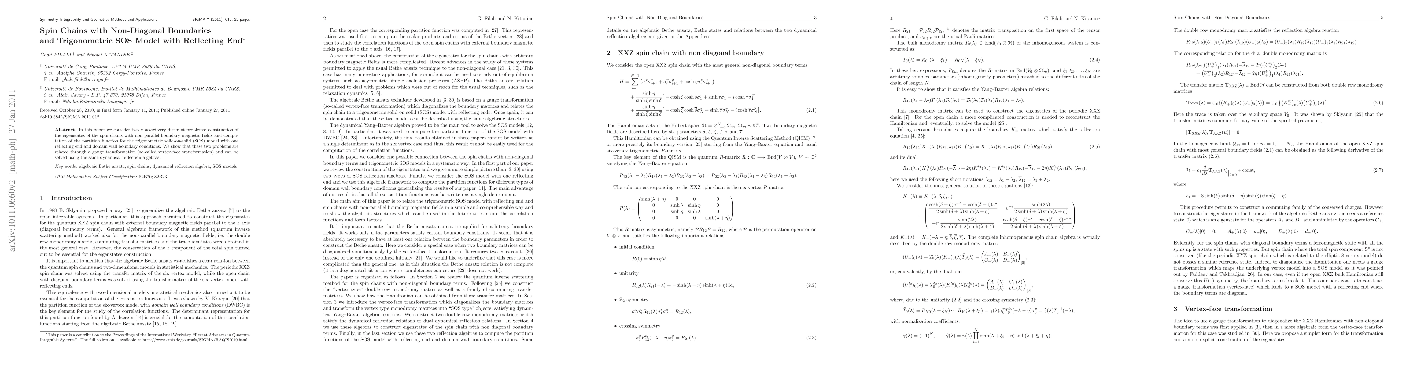 This paper connects the eigenstates of spin chains with non-parallel boundary magnetic fields to the partition function of the trigonometric SOS model with a reflecting end, demonstrating their equivalence via a vertex-face transformation and utilizing dynamical reflection algebras for solution.