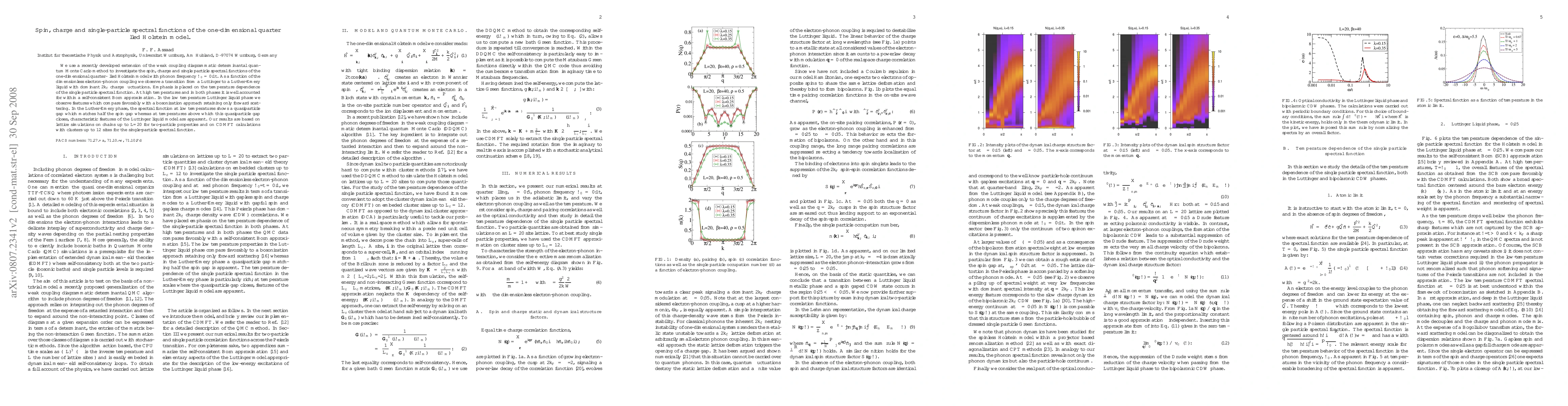 This paper investigates the spin, charge, and single-particle spectral functions of the 1D quarter-filled Holstein model using advanced quantum Monte Carlo methods. It reveals a transition from Luttinger to Luther-Emery liquid phases with distinct temperature-dependent spectral features, including a quasiparticle gap in the Luther-Emery phase.