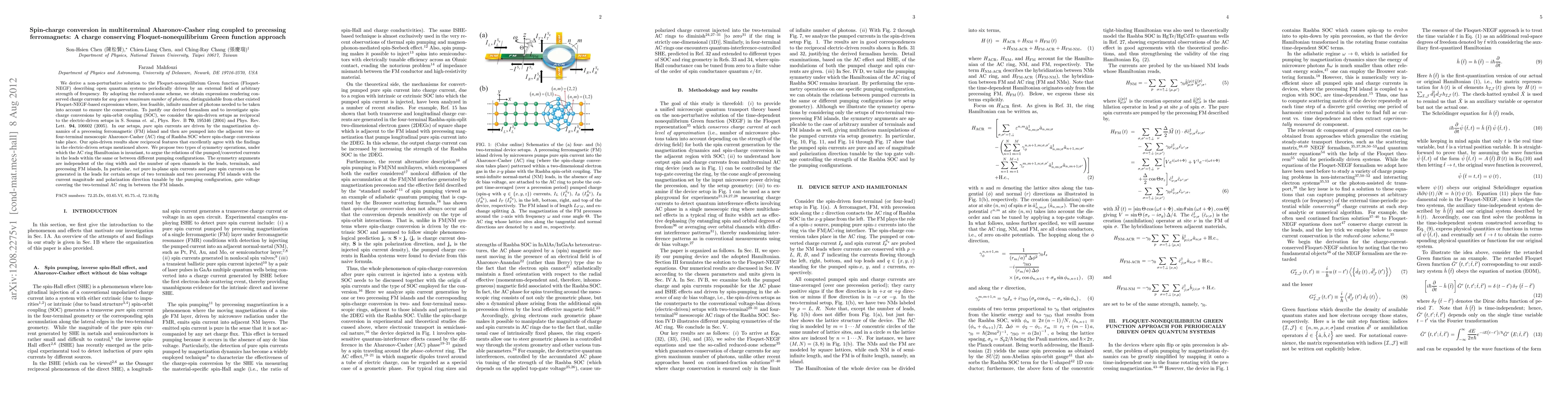 This paper derives a non-perturbative solution for the Floquet-nonequilibrium Green function to describe quantum systems driven by external fields, achieving charge conservation with a finite number of photons. It investigates spin-charge conversion in multiterminal Aharonov-Casher rings driven by precessing ferromagnets, showing reciprocal spin-driven results that align with previous electric-driven studies.