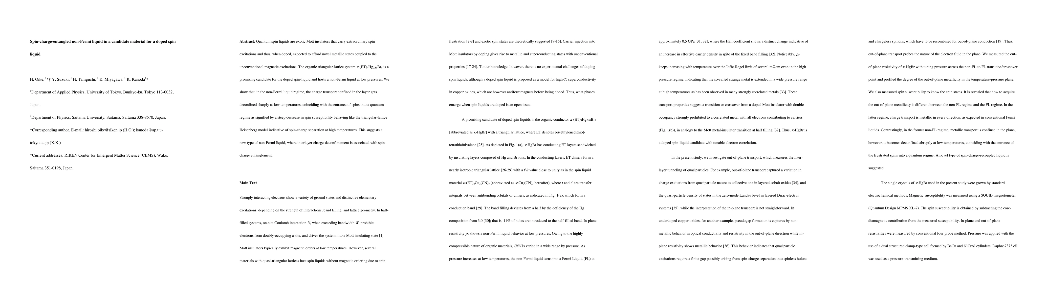 The paper investigates the k-(ET)4Hg2.89Br8 material, a candidate for a doped spin liquid, revealing a spin-charge-entangled non-Fermi liquid state. At low temperatures, charge transport deconfines, coinciding with spin behavior indicative of spin-charge separation, suggesting a novel non-Fermi liquid state.