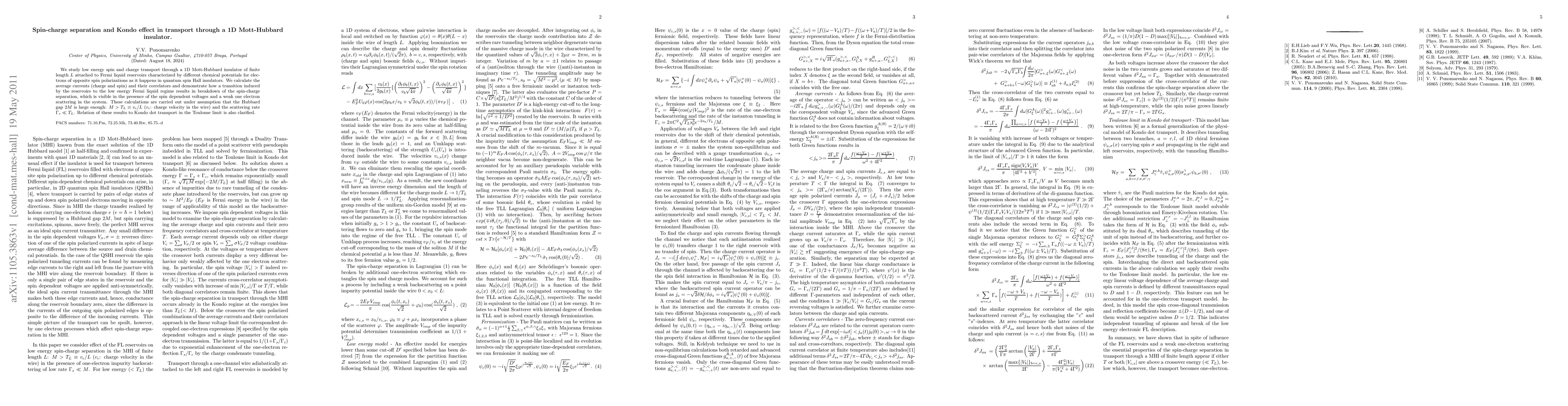 This paper investigates low-energy spin and charge transport in a 1D Mott-Hubbard insulator connected to spin-polarized Fermi liquid reservoirs, revealing the breakdown of spin-charge separation due to a transition to the low energy regime, and relates these findings to Kondo effect dynamics in the Toulouse limit.