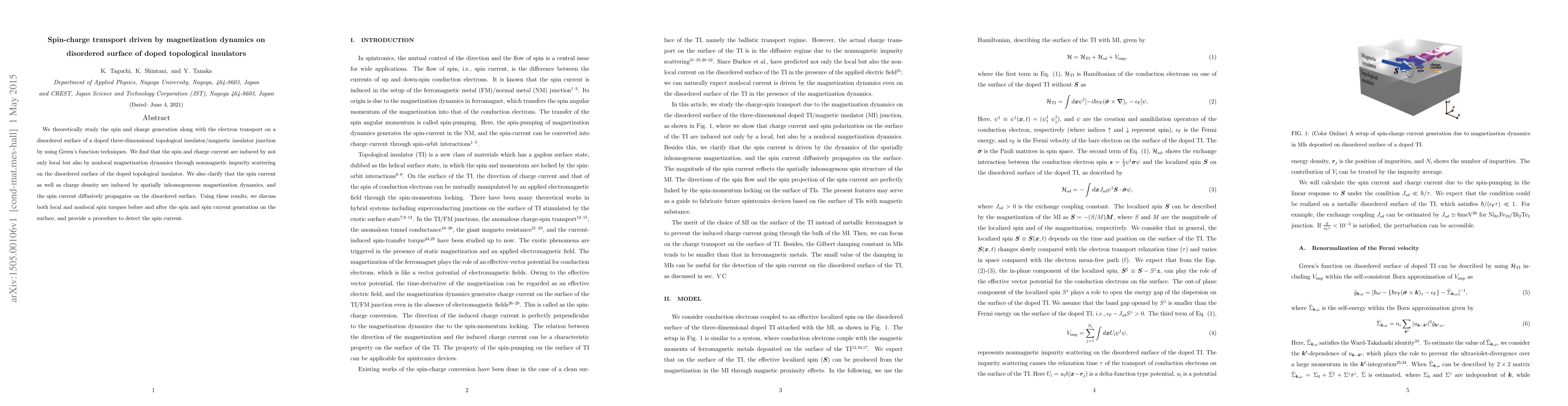 This paper theoretically investigates spin-charge transport mechanisms in disordered doped topological insulators, revealing that both local and nonlocal magnetization dynamics induce spin and charge currents via nonmagnetic impurity scattering. It also discusses the propagation of spin current and provides a method for its detection.