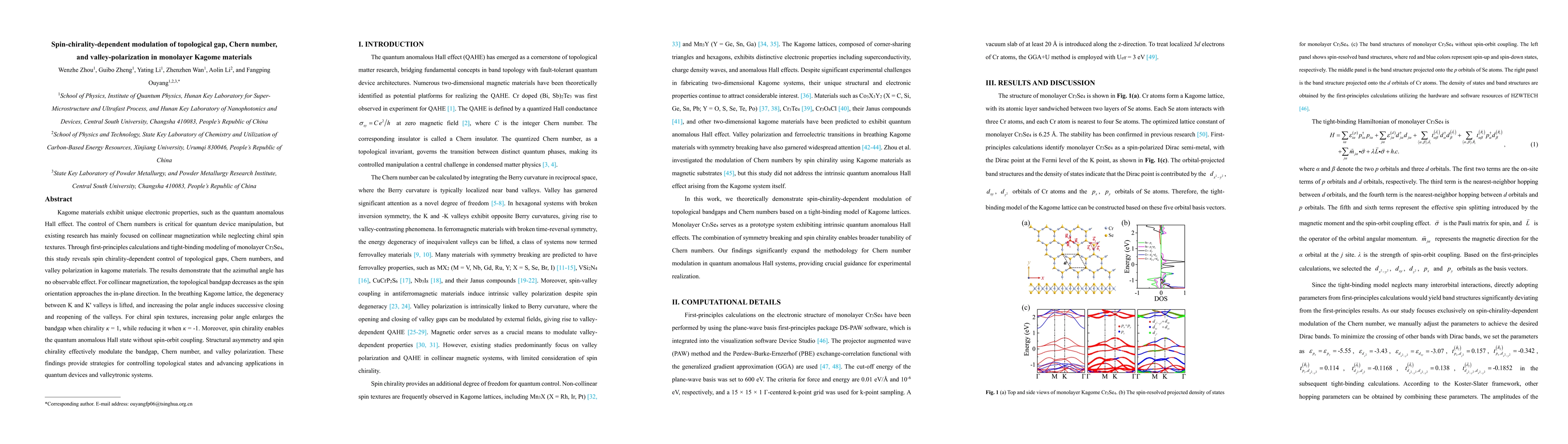 Kagome materials exhibit unique electronic properties, such as the quantum anomalous Hall effect. The control of Chern numbers is critical for quantum device manipulation, but existing research has mainly focused on collinear magnetization while neglecting chiral spin textures. Through first-principles calculations and tight-binding modeling of monolayer Cr3Se4, this study reveals spin chirality-dependent control of topological gaps, Chern numbers, and valley polarization in kagome materials. The results demonstrate that the azimuthal angle has no observable effect. For collinear magnetization, the topological bandgap decreases as the spin orientation approaches the in-plane direction. In the breathing Kagome lattice, the degeneracy between K and K' valleys is lifted, and increasing the polar angle induces successive closing and reopening of the valleys. For chiral spin textures, increasing polar angle enlarges the bandgap when chirality \k{appa} = 1, while reducing it when \k{appa} = -1. Moreover, spin chirality enables the quantum anomalous Hall state without spin-orbit coupling. Structural asymmetry and spin chirality effectively modulate the bandgap, Chern number, and valley polarization. These findings provide strategies for controlling topological states and advancing applications in quantum devices and valleytronic systems.