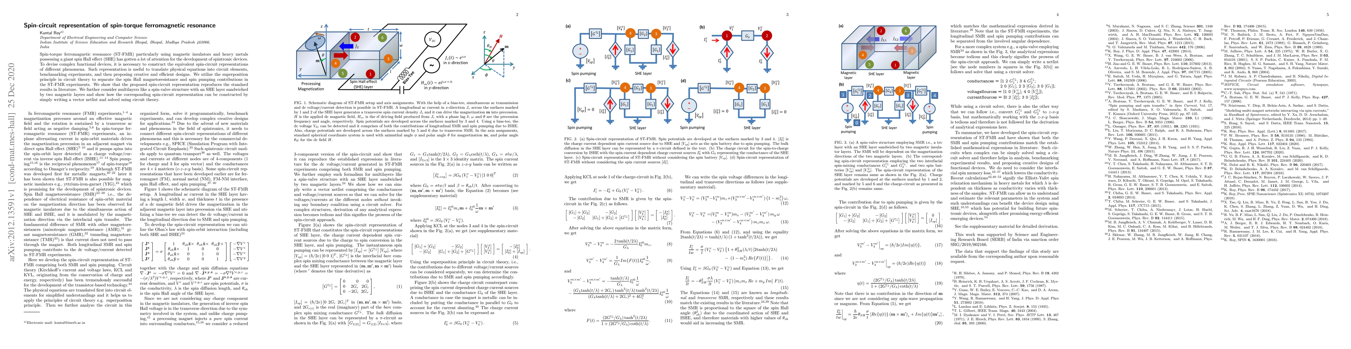 Spin-torque ferromagnetic resonance (ST-FMR) particularly using magnetic insulators and heavy metals possessing a giant spin Hall effect (SHE) has gotten a lot of attention for the development of spintronic devices. To devise complex functional devices, it is necessary to construct the equivalent spin-circuit representations of different phenomena. Such representation is useful to translate physical equations into circuit elements, benchmarking experiments, and then proposing creative and efficient designs. We utilize the superposition principle in circuit theory to separate the spin Hall magnetoresistance and spin pumping contributions in the ST-FMR experiments. We show that the proposed spin-circuit representation reproduces the standard results in literature. We further consider multilayers like a spin-valve structure with an SHE layer sandwiched by two magnetic layers and show how the corresponding spin-circuit representation can be constructed by simply writing a vector netlist and solved using circuit theory.