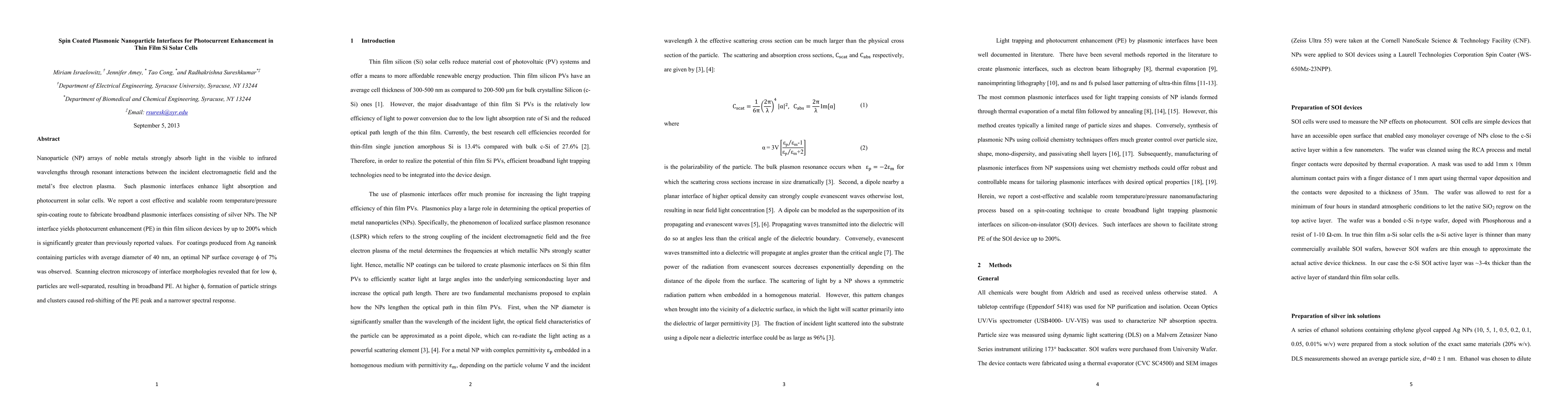 This paper presents a scalable spin-coating method for creating broadband plasmonic interfaces using silver nanoparticles to enhance photocurrent in thin film silicon solar cells, achieving up to 200% improvement, with optimal performance at 7% surface coverage. Higher coverage leads to particle clustering and a narrower spectral response.