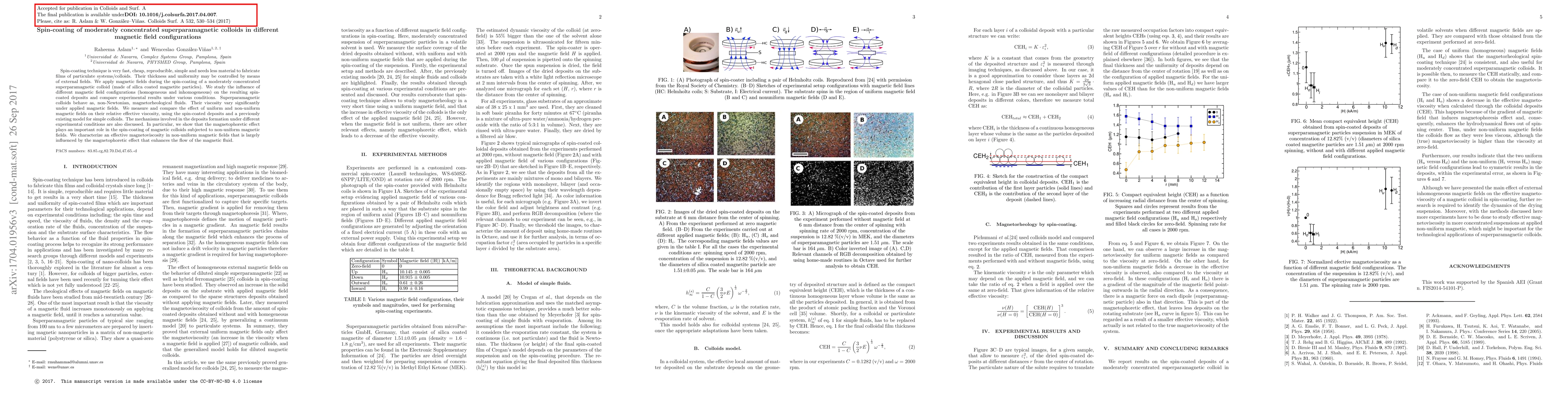 Spin-coating technique is very fast, cheap, reproducible, simple and needs less material to fabricate films of particulate systems/colloids. Their thickness and uniformity may be controlled by means of external fields. We apply magnetic fields during the spin-coating of a moderately concentrated superparamagnetic colloid (made of silica coated magnetite particles). We study the influence of different magnetic field configurations (homogeneous and inhomogeneous) on the resulting spin-coated deposits and compare experimental results under various conditions. Superparamagnetic colloids behave as, non-Newtonian, magnetorheological fluids. Their viscosity vary significantly under applied magnetic fields. We measure and compare the effect of uniform and non-uniform magnetic fields on their relative effective viscosity, using the spin-coated deposits and a previously existing model for simple colloids. The mechanisms involved in the deposits formation under different experimental conditions are also discussed. In particular, we show that the magnetophoretic effect plays an important role in the spin-coating of magnetic colloids subjected to non-uniform magnetic fields. We characterize an effective magnetoviscosity in non-uniform magnetic fields that is largely influenced by the magnetophoretic effect that enhances the flow of the magnetic fluid.