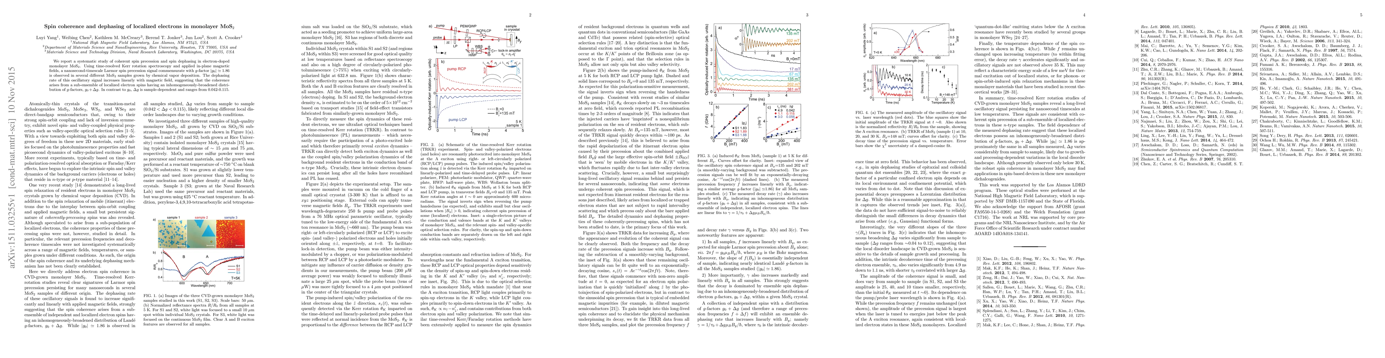 We report a systematic study of coherent spin precession and spin dephasing in electron-doped monolayer MoS$_2$. Using time-resolved Kerr rotation spectroscopy and applied in-plane magnetic fields, a nanosecond-timescale Larmor spin precession signal commensurate with $g$-factor $|g_0|\simeq 1.86$ is observed in several different MoS$_2$ samples grown by chemical vapor deposition. The dephasing rate of this oscillatory signal increases linearly with magnetic field, suggesting that the coherence arises from a sub-ensemble of localized electron spins having an inhomogeneously-broadened distribution of $g$-factors, $g_0 + \Delta g$. In contrast to $g_0$, $\Delta g$ is sample-dependent and ranges from 0.042 to 0.115.