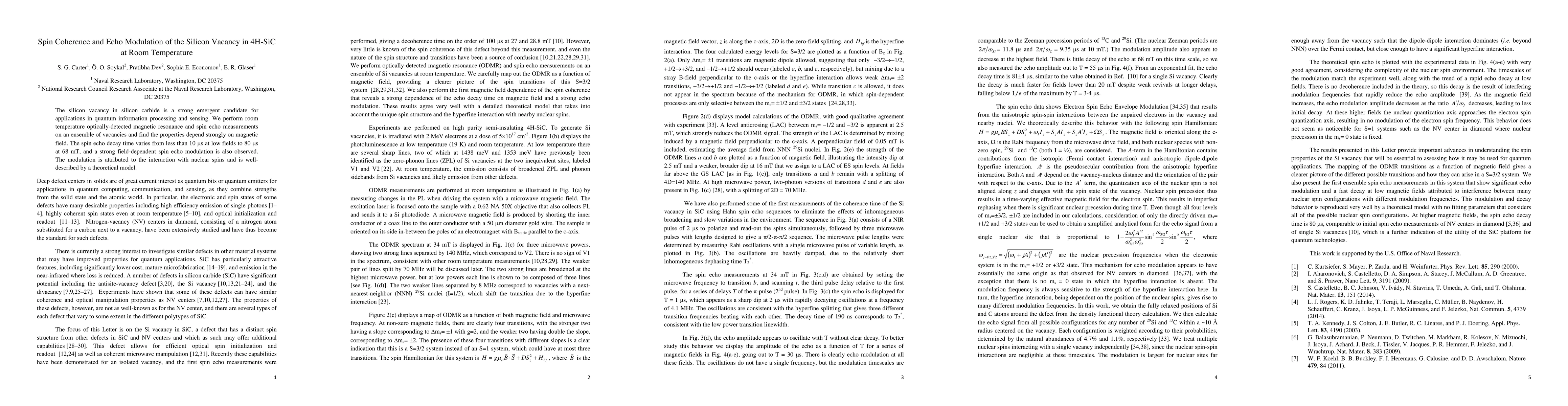 This study investigates the spin coherence and echo modulation of silicon vacancies in 4H-SiC at room temperature using optically-detected magnetic resonance and spin echo measurements. The findings reveal a significant field-dependent spin echo decay and modulation, attributed to nuclear spin interactions and well-explained by a theoretical model.