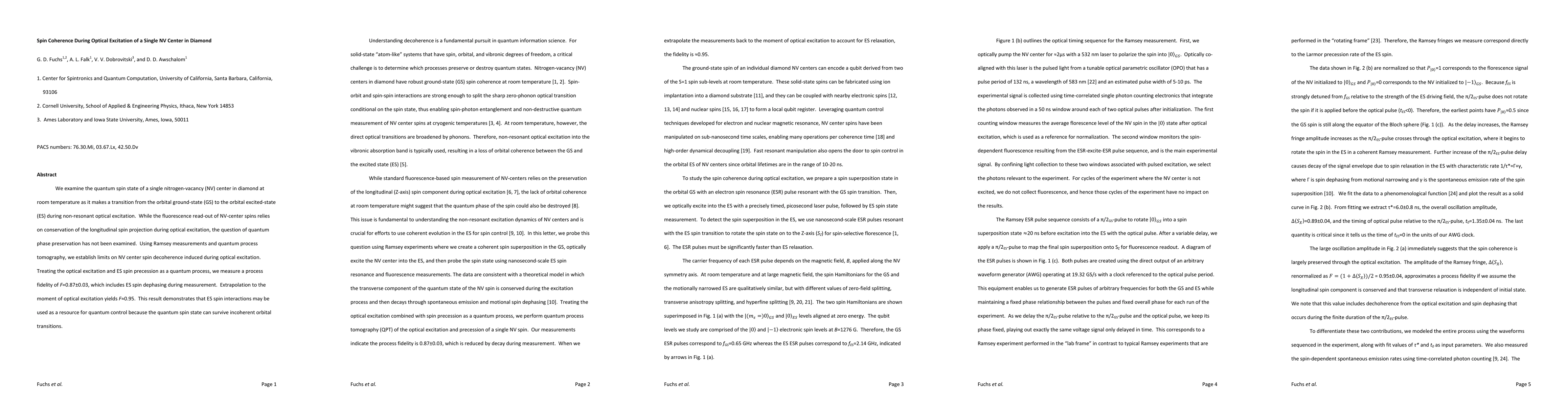 This paper investigates the quantum spin coherence of a single NV center in diamond during optical excitation from the ground state to the excited state, finding high fidelity (F ≈ 0.95) in spin state preservation, indicating potential for quantum control applications.
