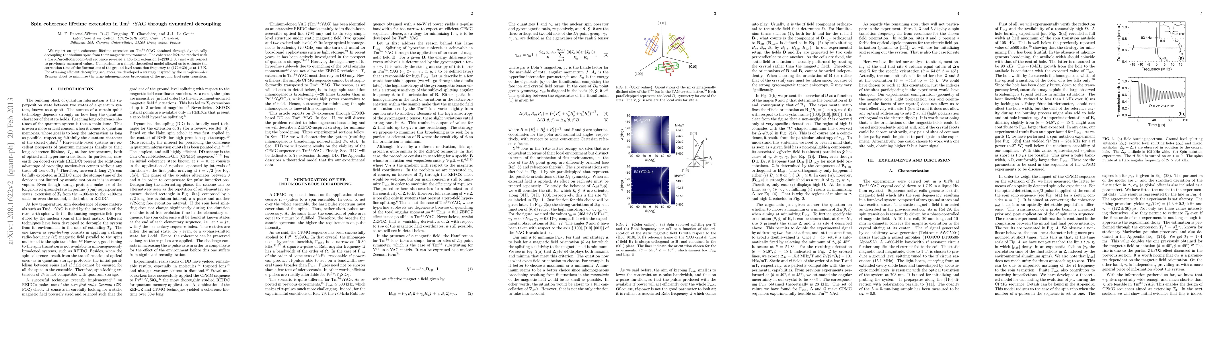 We report on spin coherence lifetime extension on Tm$^{3+}$:YAG obtained through dynamically decoupling the thulium spins from their magnetic environment. The coherence lifetime reached with a Carr-Purcell-Meiboom-Gill sequence revealed a 450-fold extension [$\sim$$(230 \pm 30)$ ms] with respect to previously measured values. Comparison to a simple theoretical model allowed us to estimate the correlation time of the fluctuations of the ground level transition frequency to $(172 \pm 30)$ $\mu$s at 1.7 K. For attaining efficient decoupling sequences, we developed a strategy inspired by the \emph{zero-first-order Zeeman} effect to minimize the large inhomogeneous broadening of the ground level spin transition.