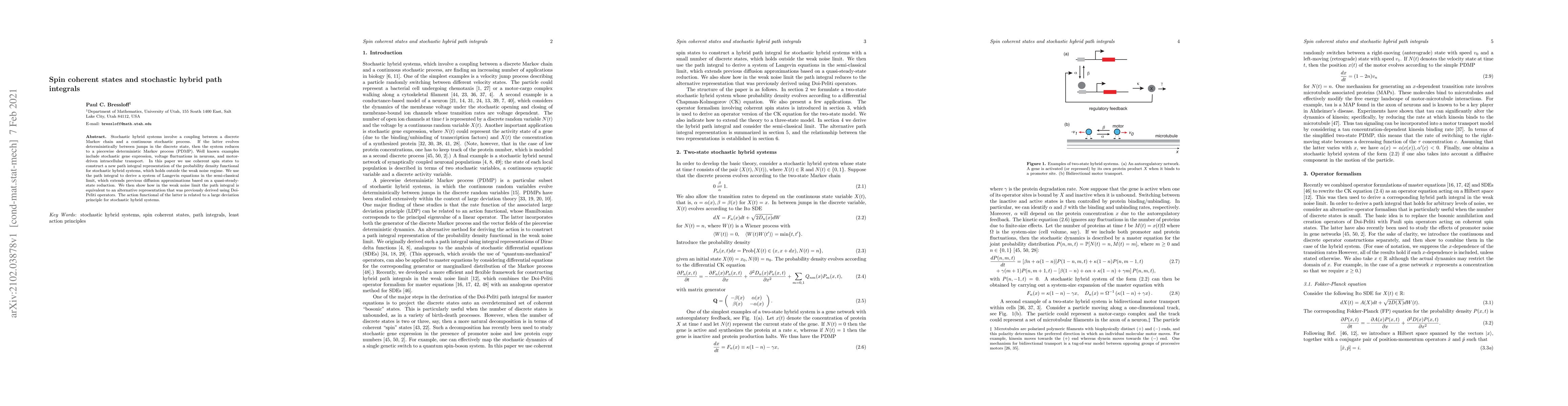 This paper introduces a new path integral representation for stochastic hybrid systems using coherent spin states, extending beyond the weak noise regime. It derives Langevin equations in the semi-classical limit and shows equivalence to an alternative representation in the weak noise limit, linking it to a large deviation principle.
