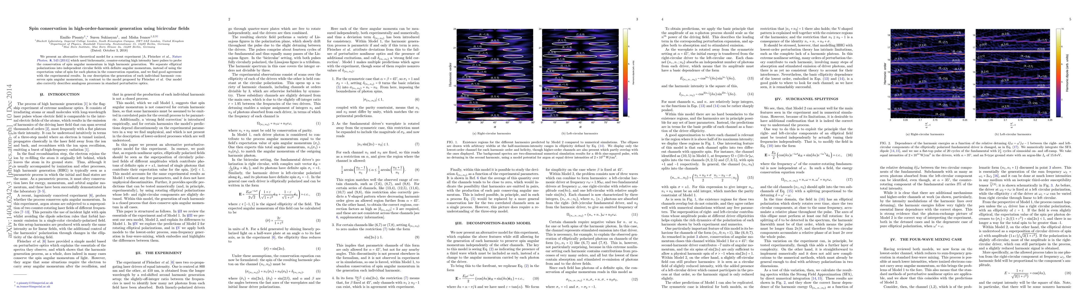 We present an alternative theoretical model for a recent experiment [A.Fleischer et al., Nature Photon. 8, 543 (2014)] which used bichromatic, counter-rotating high intensity laser pulses to probe the conservation of spin angular momentum in high harmonic generation. We separate elliptical polarizations into independent circular fields with definite angular momentum, instead of using the expectation value of spin for each photon in the conservation equation, and we find good agreement with the experimental results. In our description the generation of each individual harmonic conserves spin angular momentum, in contrast to the model proposed by Fleischer et al. Our model also correctly describes analogous processes in standard perturbative optics.