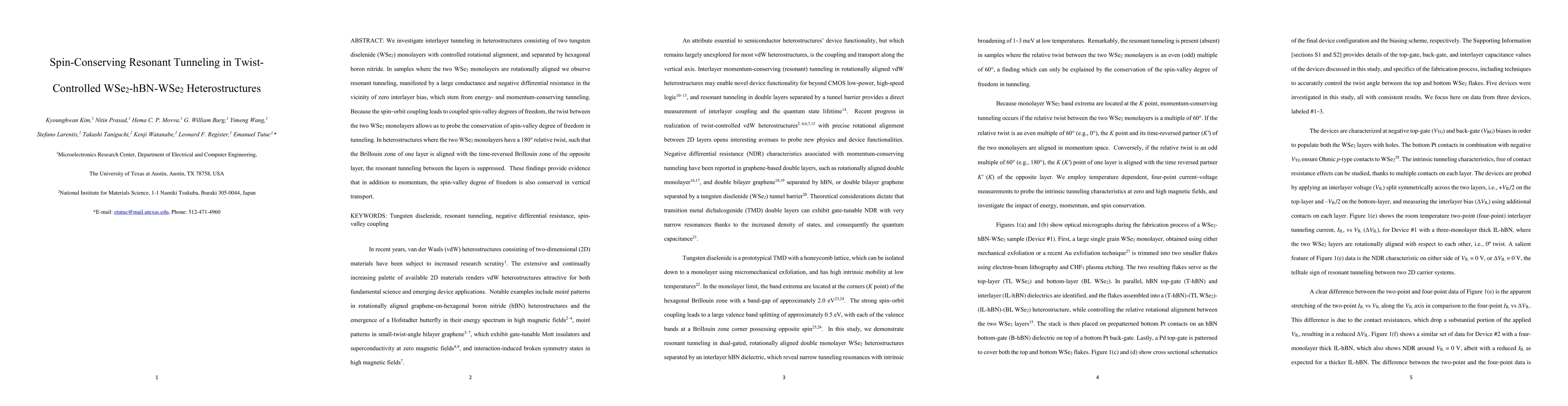 Summary: This study reveals spin-conserving resonant tunneling in twist-controlled WSe2-hBN-WSe2 heterostructures, demonstrating large conductance and negative differential resistance due to energy- and momentum-conserving tunneling. The 180° twist suppresses resonant tunneling, indicating the conservation of spin-valley degrees of freedom in vertical transport.