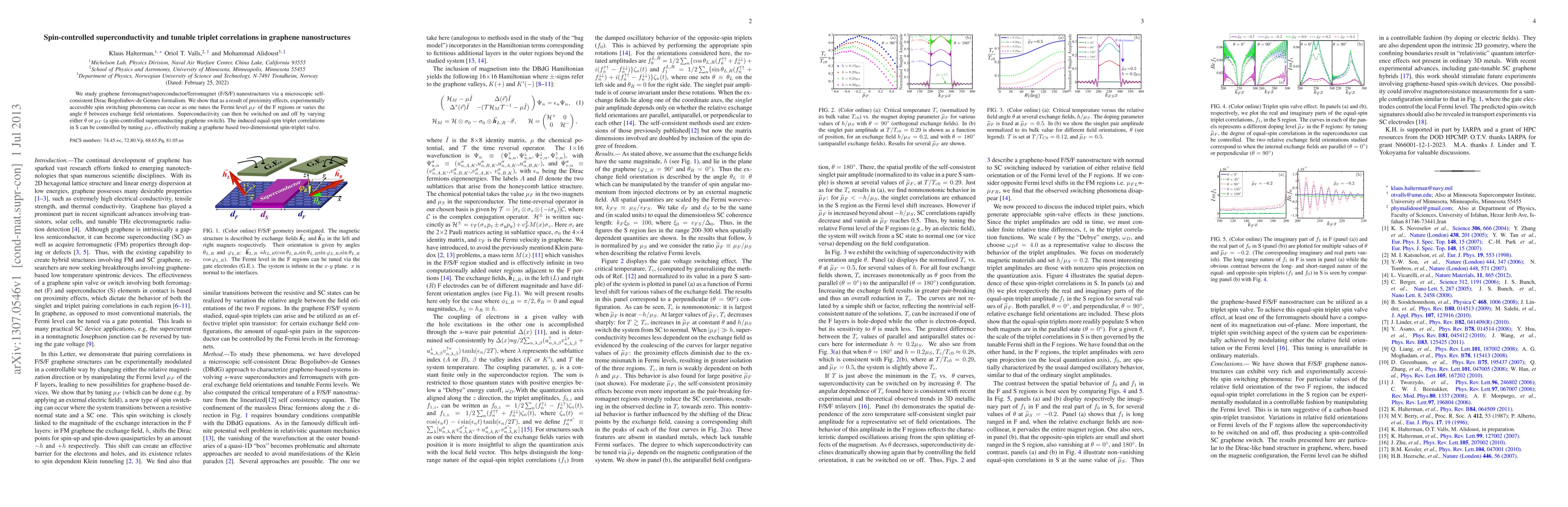 This paper explores spin-controlled superconductivity in graphene nanostructures using a Dirac Bogoliubov-de Gennes formalism. It demonstrates that spin switching and superconductivity can be manipulated by tuning the Fermi level or the angle between exchange fields, creating a graphene-based spin-controlled superconducting switch and a tunable two-dimensional spin-triplet valve.