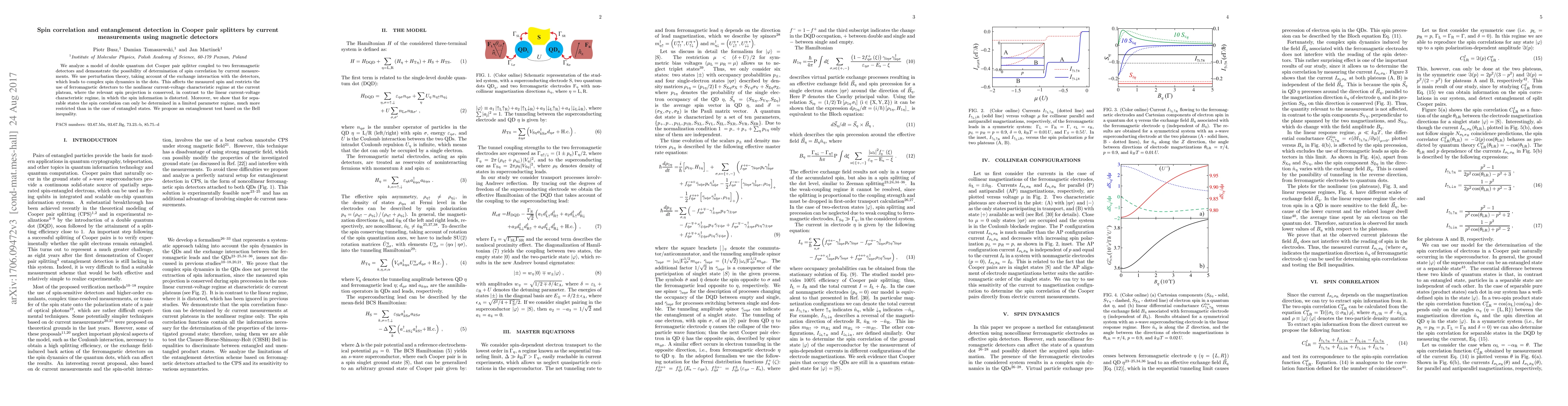 The paper presents a theoretical framework for analyzing spin correlation and entanglement in Cooper pair splitters using current measurements with ferromagnetic detectors, taking into account exchange interaction and spin dynamics.