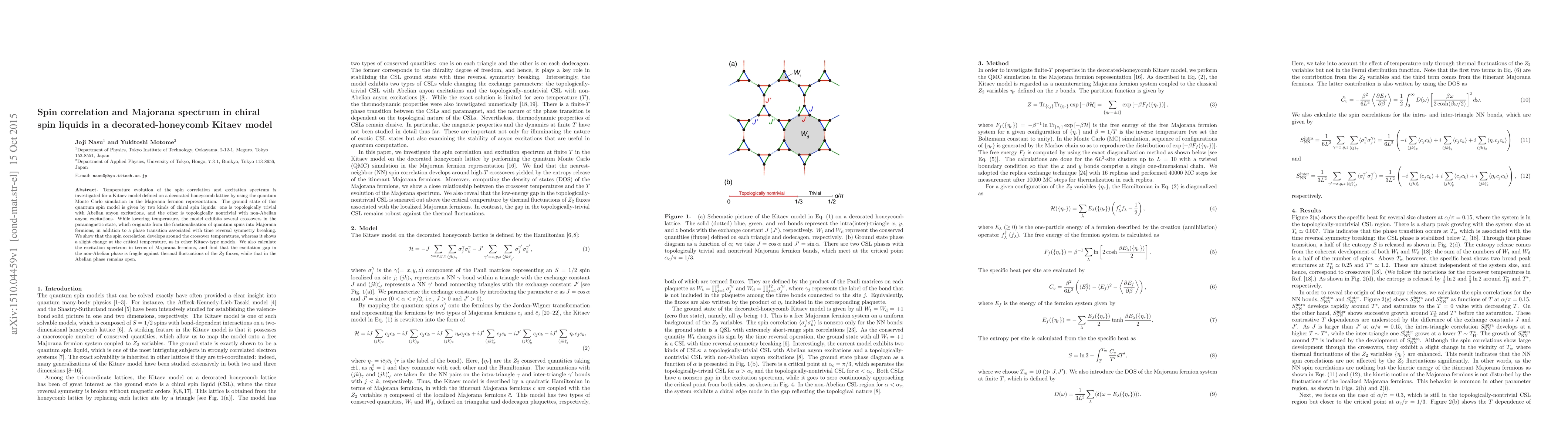 This paper investigates the temperature-dependent spin correlation and excitation spectrum in a decorated-honeycomb Kitaev model using quantum Monte Carlo simulations. It reveals two chiral spin liquid phases, one trivial and one non-trivial, with distinct anyon excitations, and finds that the spin correlation evolves at crossover temperatures due to Majorana fermion fractionalization.