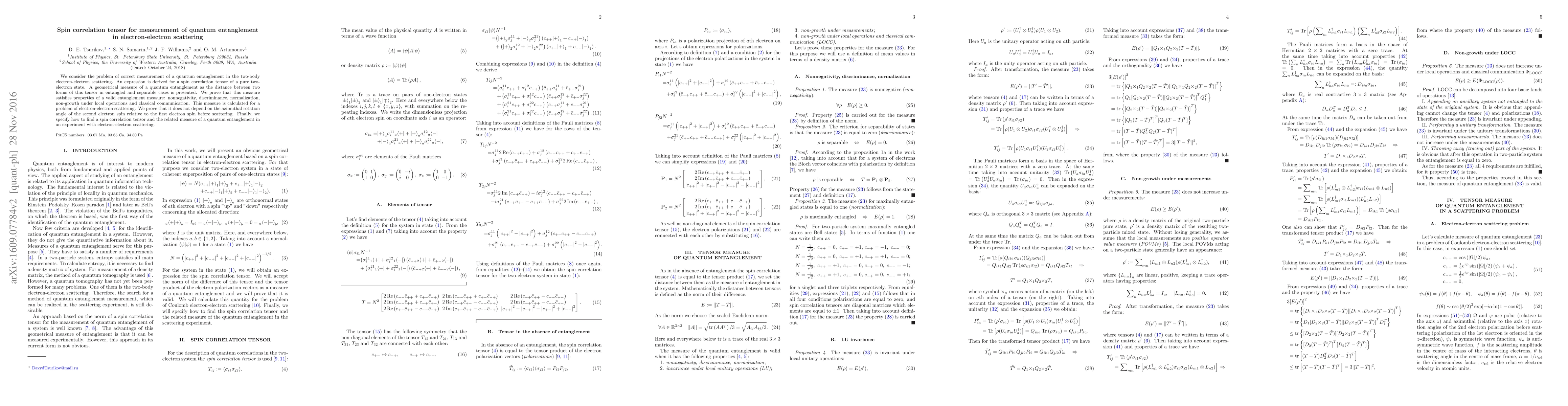This paper derives a spin correlation tensor to measure quantum entanglement in electron-electron scattering, proving it satisfies key entanglement measure properties. It demonstrates the tensor's independence from azimuthal rotation angles and provides a method for experimental measurement.