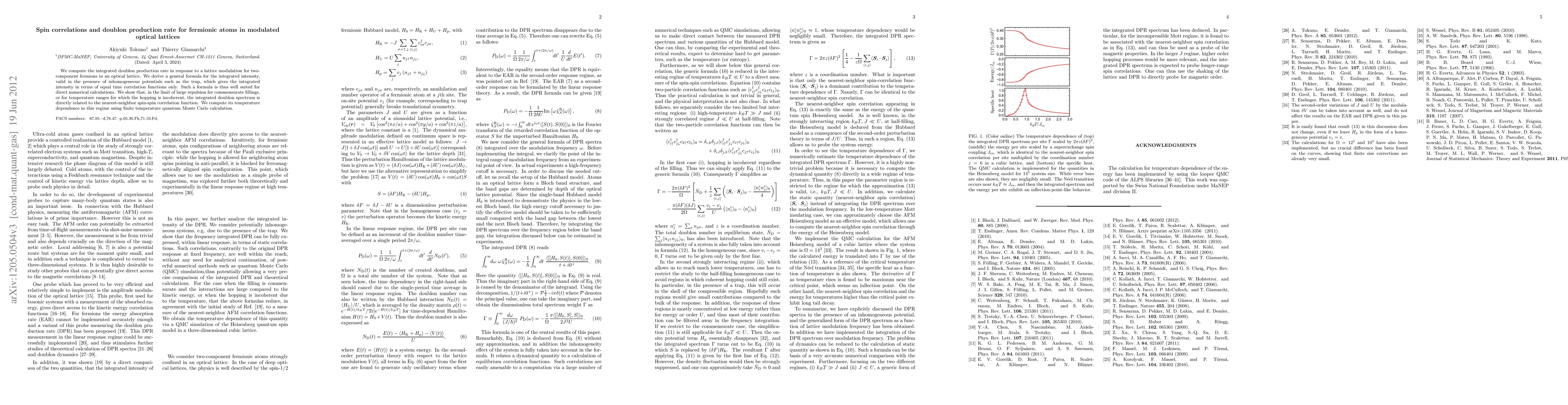 This paper derives a general formula for the integrated doublon production rate in modulated optical lattices for two-component fermions, relating it to equal time correlation functions and demonstrating its applicability for numerical calculations. It further shows that under certain conditions, the integrated doublon spectrum correlates with the nearest neighbor spin-spin correlation, and computes its temperature dependence using quantum Monte Carlo methods.