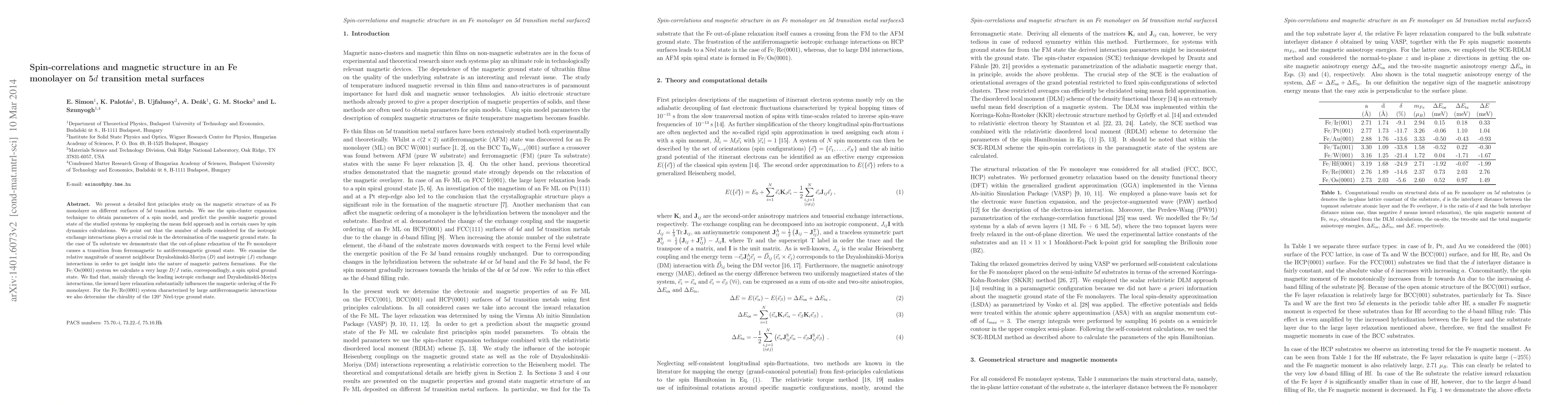 Researchers studied magnetic properties of Fe monolayers on 5d transition metal surfaces using first principles methods, finding that relaxation of the monolayer affects its magnetic state and discovering spin spirals and Néel-type ground states.
