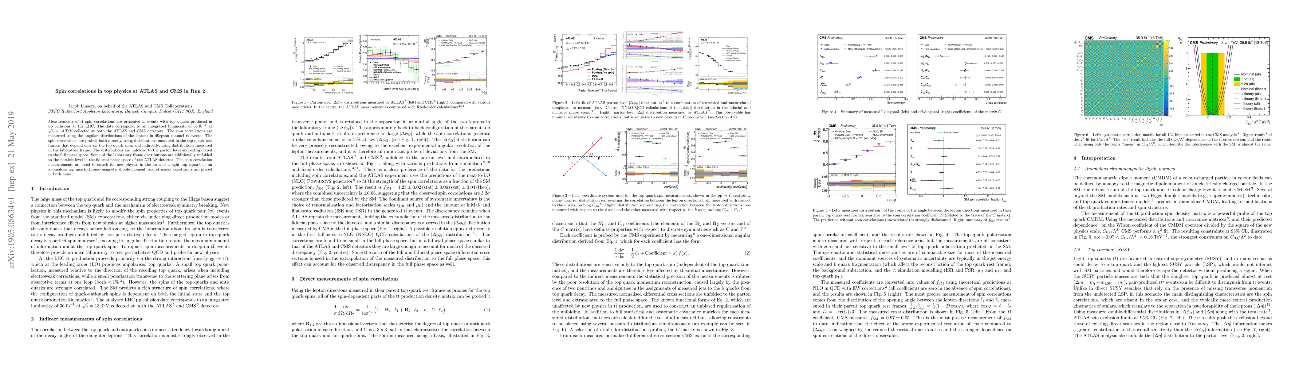 Measurements of $\mathrm{t\bar{t}}$ spin correlations are presented in events with top quarks produced in $\mathrm{pp}$ collisions at the LHC. The data correspond to an integrated luminosity of $36\:\mathrm{fb^{-1}}$ at $\sqrt{s}=13\:\mathrm{TeV}$ collected at both the ATLAS and CMS detectors. The spin correlations are measured using the angular distributions of the leptons in dilepton channel $\mathrm{t\bar{t}}$ events. The spin correlations are probed both directly, using distributions measured in the top quark rest frames that depend only on the top quark spin, and indirectly, using distributions measured in the laboratory frame. The distributions are unfolded to the parton level and extrapolated to the full phase space. Some of the laboratory frame distributions are additionally unfolded to the particle level in the fiducial phase space of the ATLAS detector. The spin correlation measurements are used to search for new physics in the form of a light top squark or an anomalous top quark chromo-magnetic dipole moment, and stringent constraints are placed in both cases.